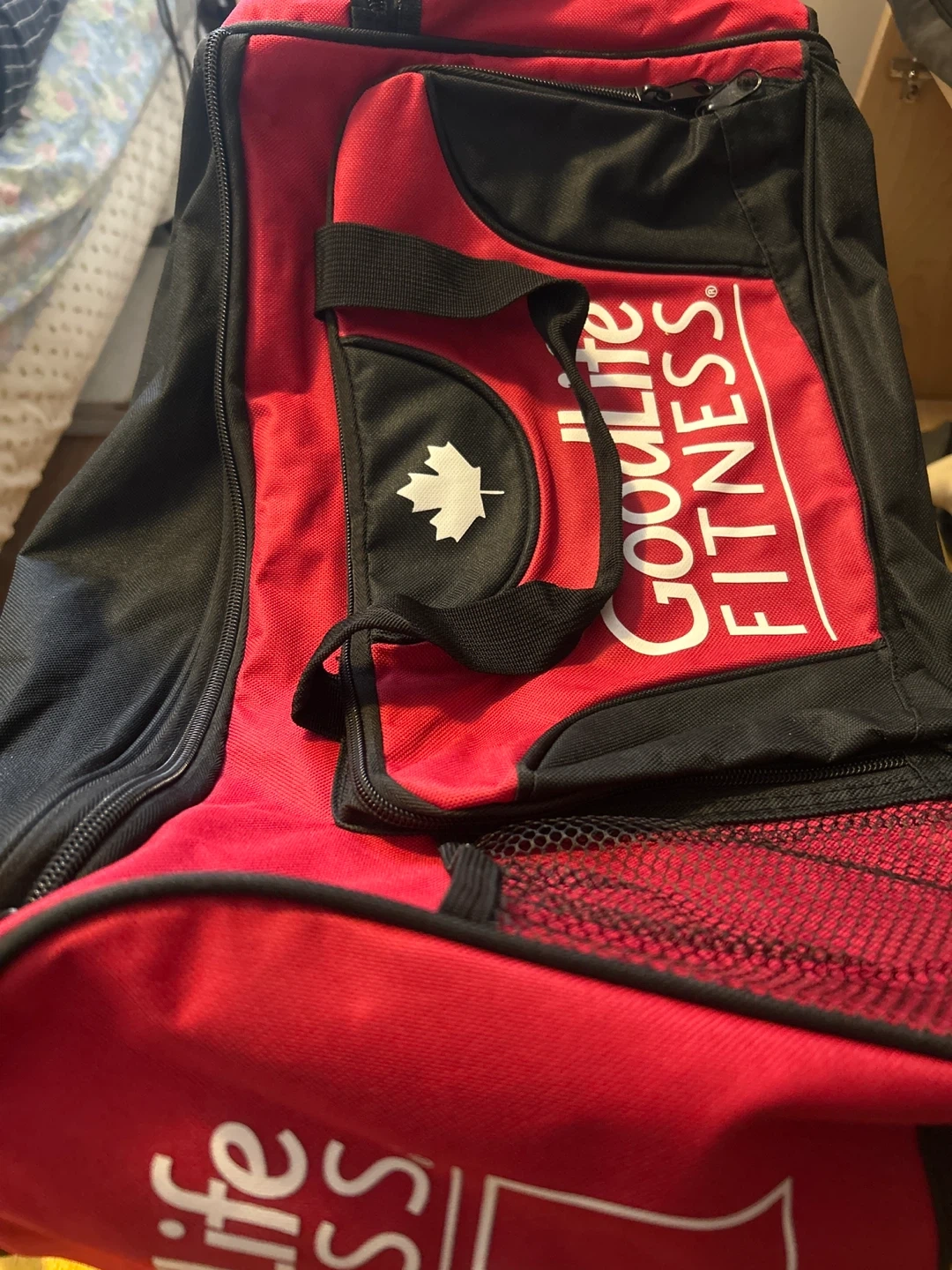 This is a Goodlife Fitness duffle bag. It's red and black with a mesh pocket and multiple zippered compartments. It's a great bag for carrying gym clothes or other essentials!
