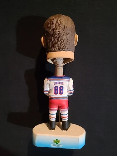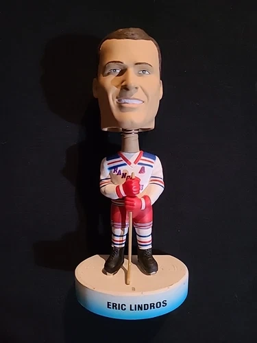 Capture a piece of hockey history with this Eric Lindros New York Rangers bobblehead. A must-have for collectors and fans alike, it features the iconic centerman in his prime with the Rangers during the 2001-2002 NHL season. This original PlayMakers piece showcases exquisite detail, from Lindros' stoic expression to the vibrant colors of the Rangers' jersey. Proudly display this vintage treasure, a true representation of sports memorabilia. Made in China, this collectible remains unmodified, ensuring its authenticity and integrity. Whether it's for your desk, shelf, or collection, this bobblehead is a tribute to one of hockey's greats and a timeless piece of sports nostalgia.
