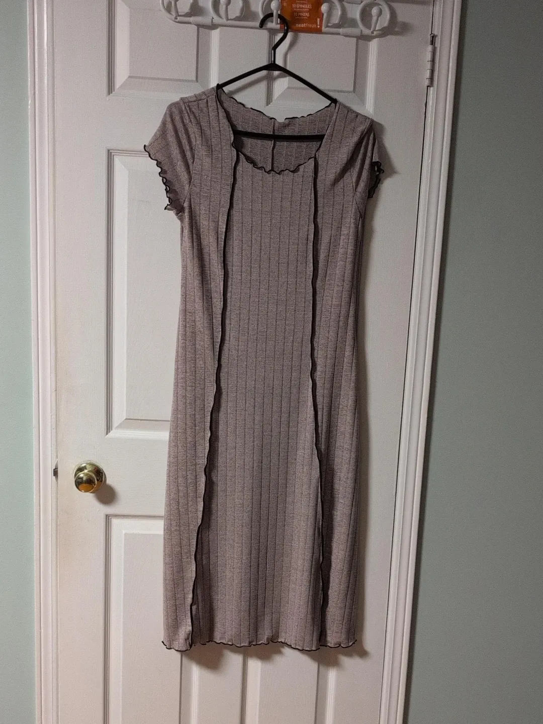 A grey ribbed knit midi dress with short sleeves. It has a contrast black stitching detail down the front. The material is stretchy.