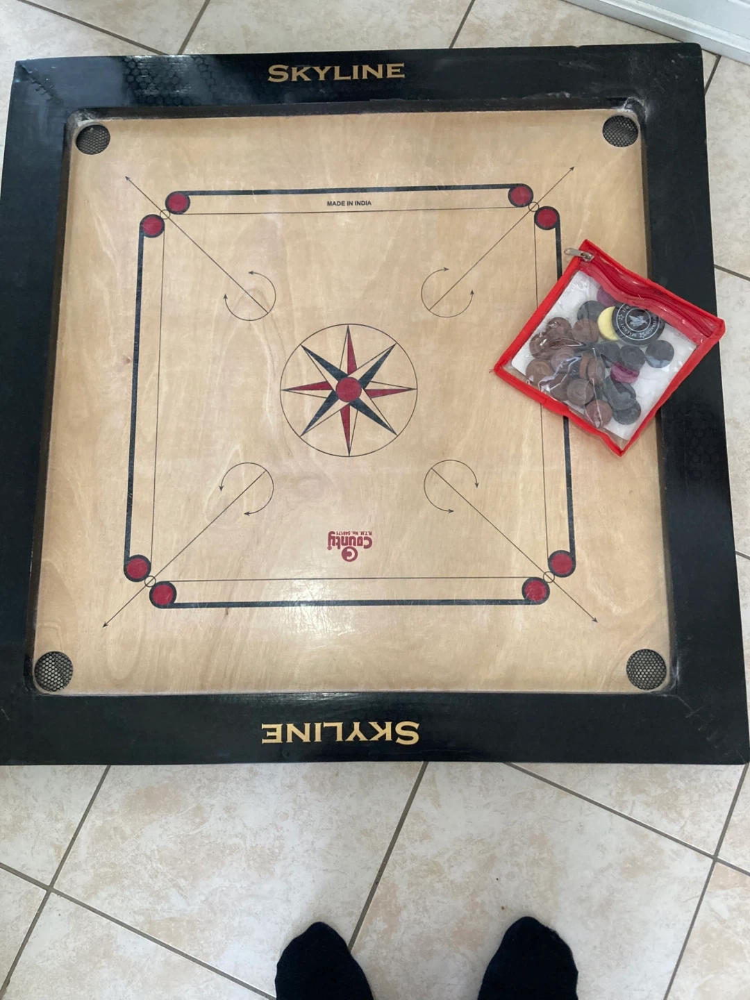Classic Skyline carrom board. Includes a set of assorted carrom coins and striker. Ready for some friendly competition!