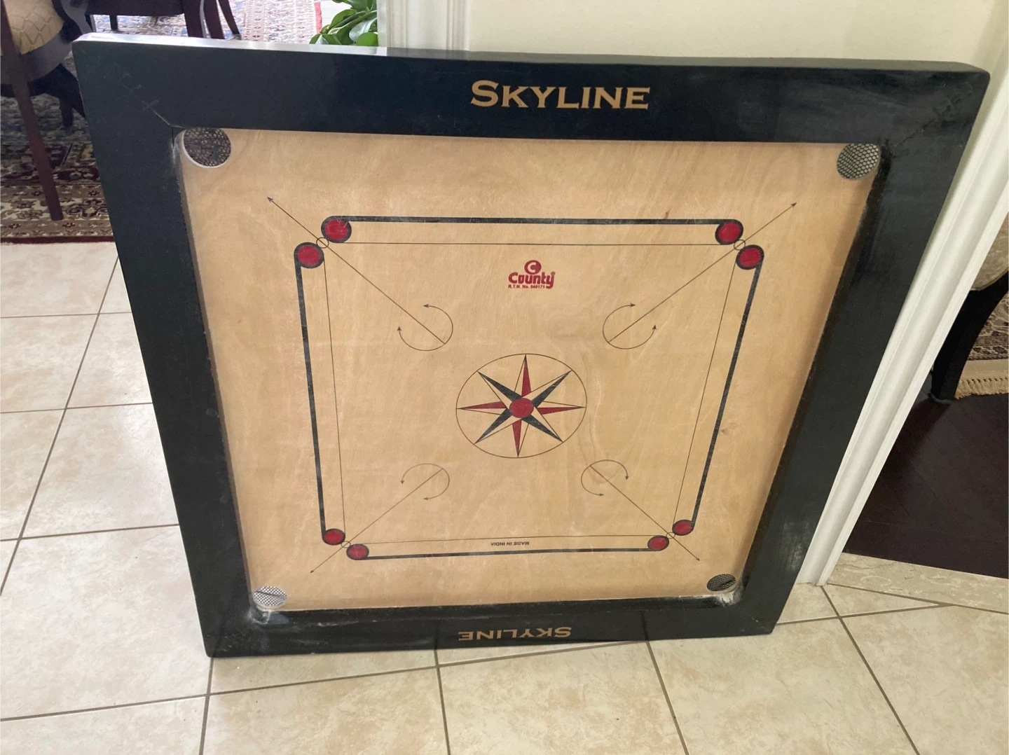 Classic Skyline carrom board. Includes a set of assorted carrom coins and striker. Ready for some friendly competition!