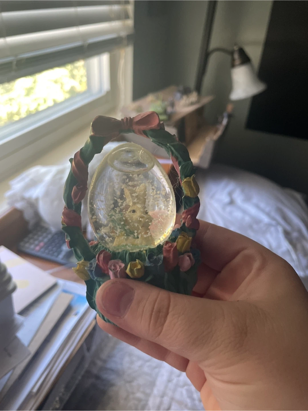 Here's a cute Easter egg snow globe in a basket design! It's got a little bunny inside and is surrounded by colourful flowers and a sweet bow. Perfect for adding a touch of spring to your home
