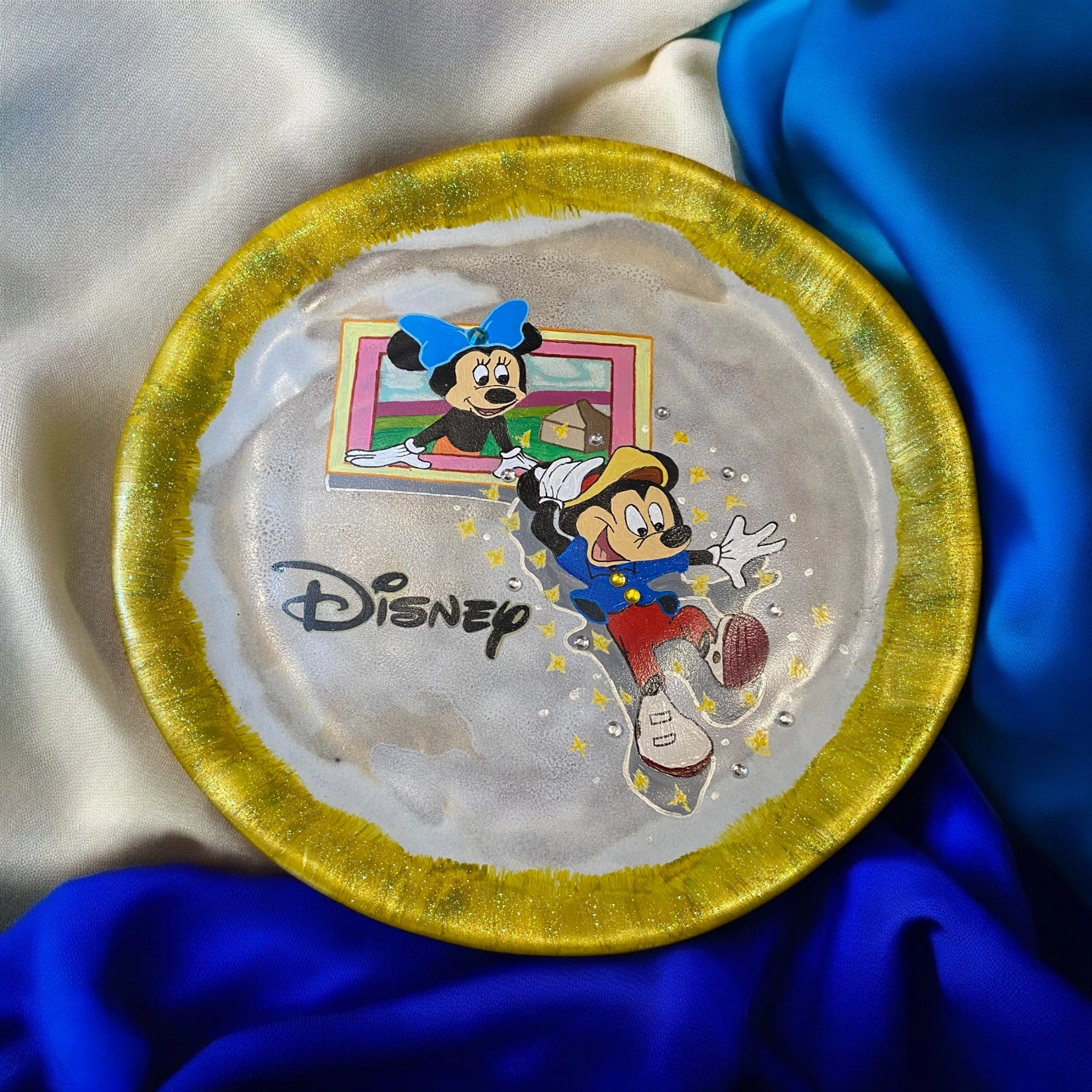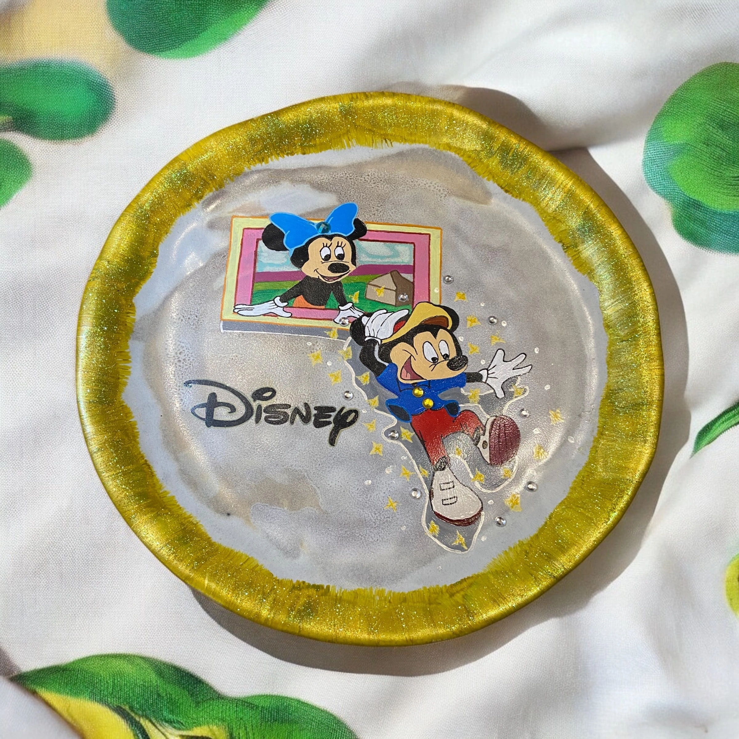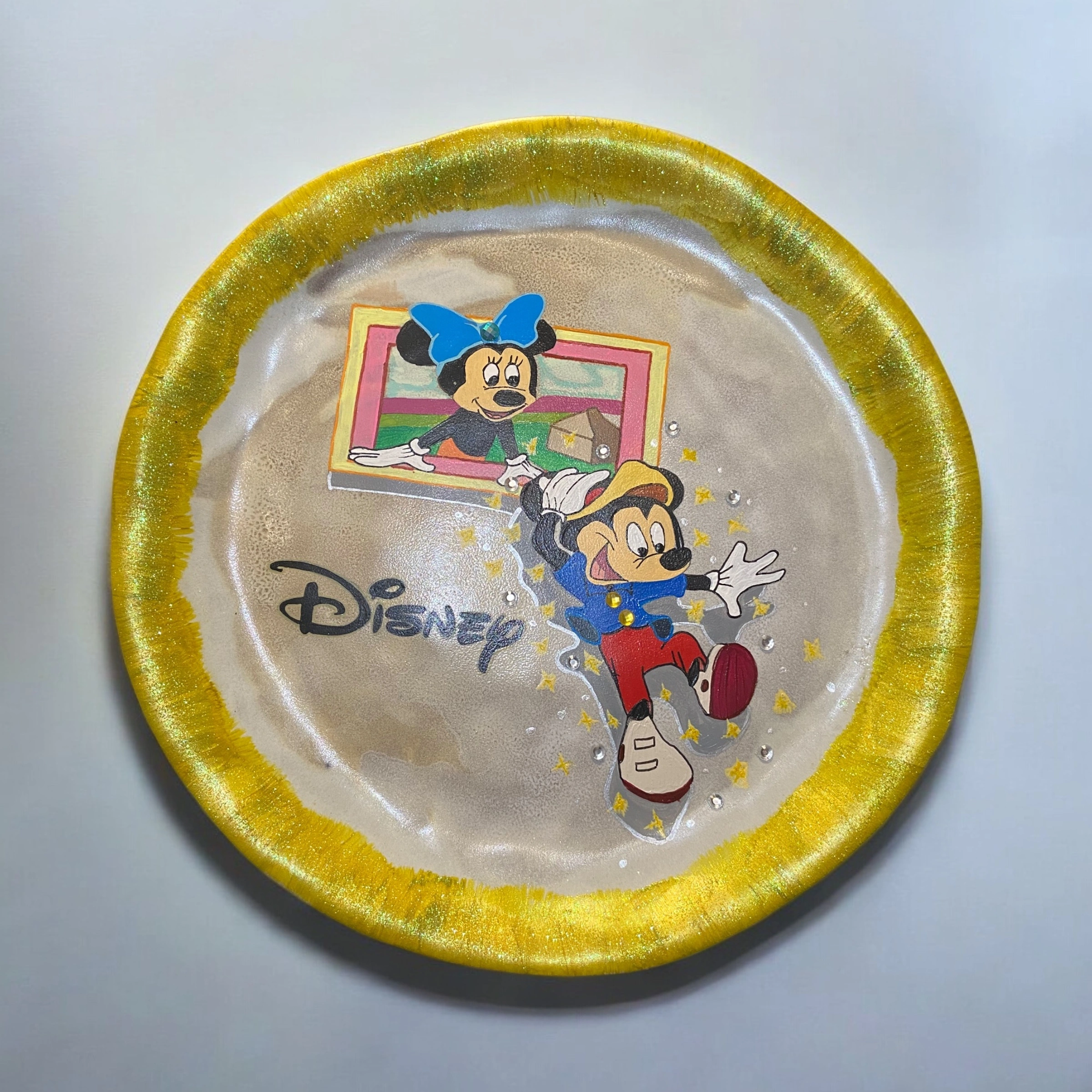 Selling a cute hand painted decorative plate featuring Mickey and Minnie Mouse! It has a gold-coloured rim and would look great on display.