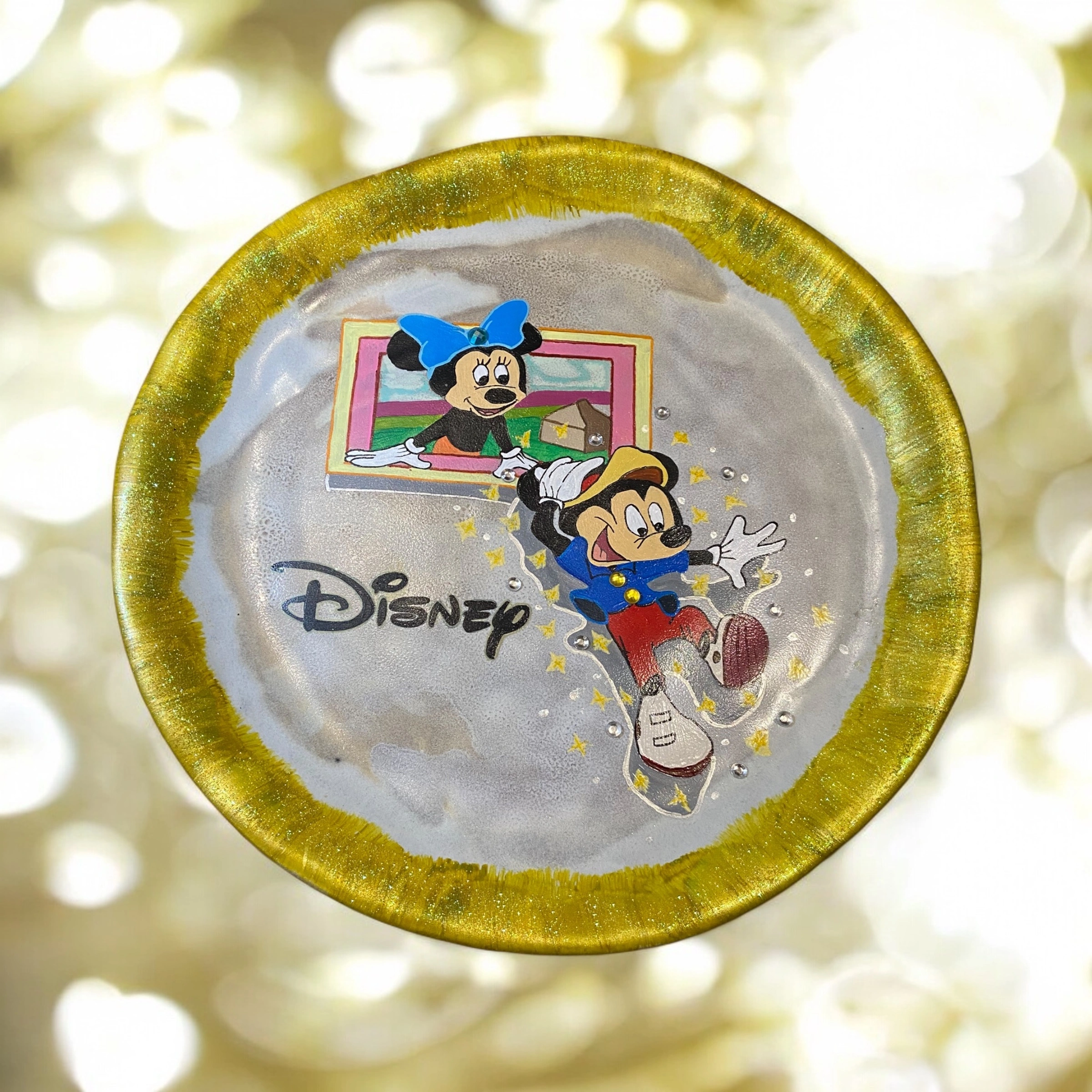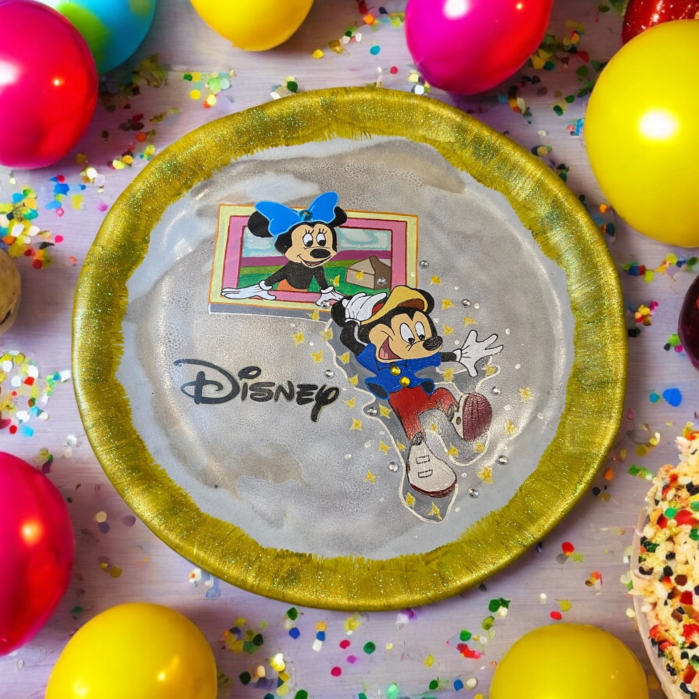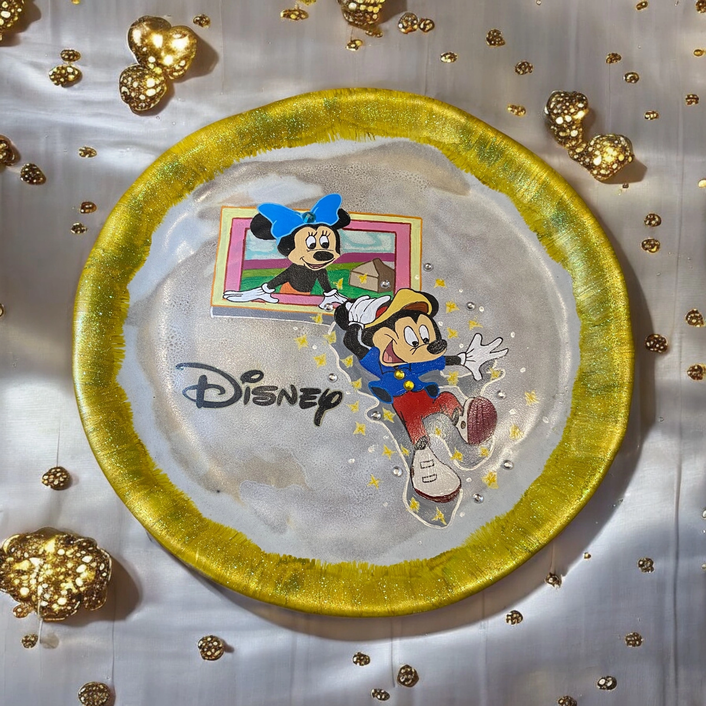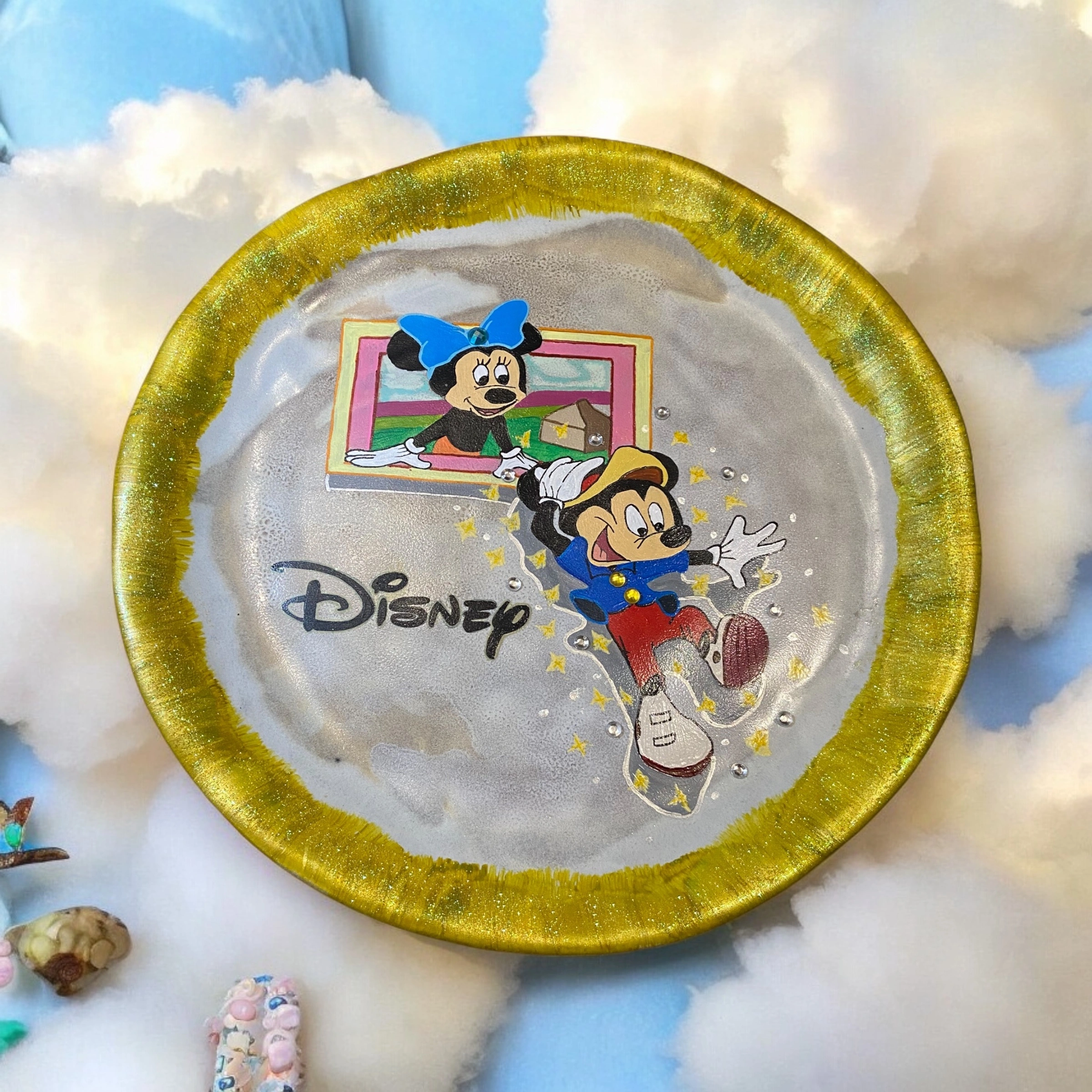 Selling a cute hand painted decorative plate featuring Mickey and Minnie Mouse! It has a gold-coloured rim and would look great on display.