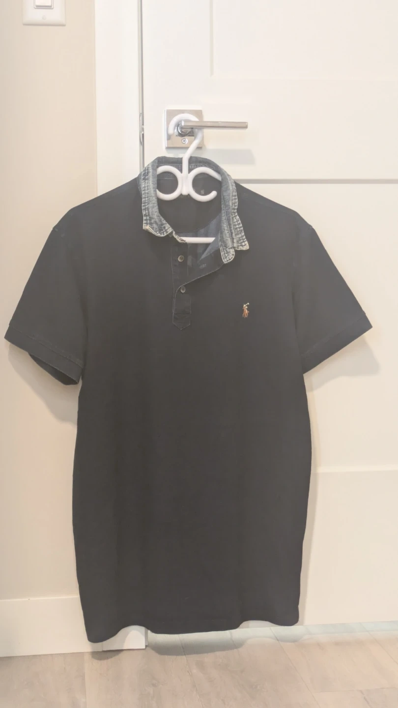 Ralph Lauren black polo shirt. Features a denim collar detail. Made with a comfortable cotton blend.