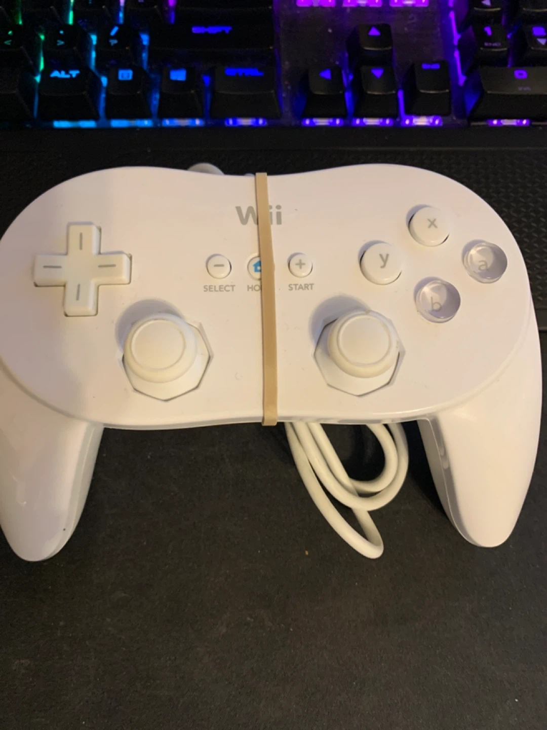 This is a white Nintendo Wii Classic Controller. It's perfect for playing Wii games that support it. This controller has a D-pad, A, B, X, and Y buttons, plus Start and Select.