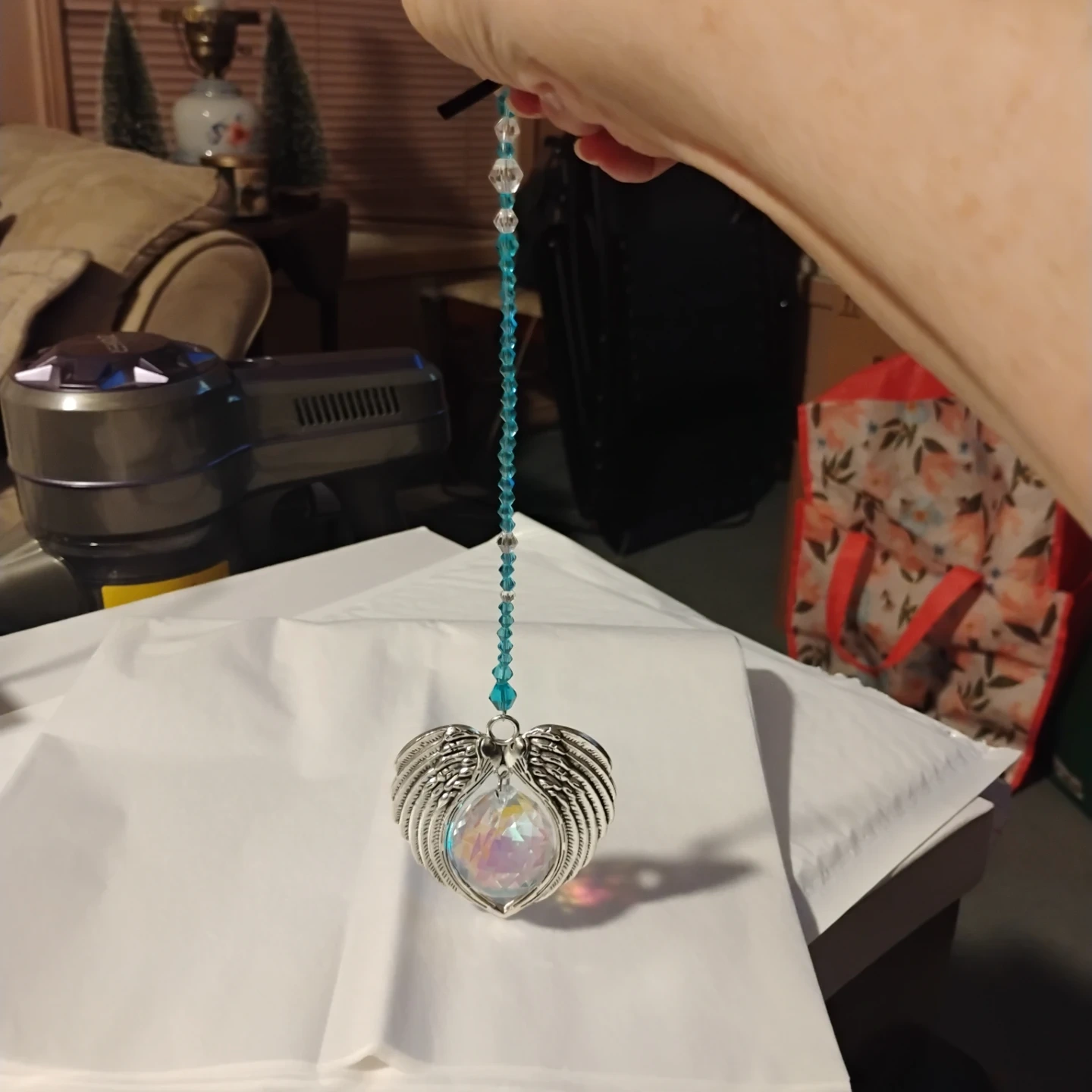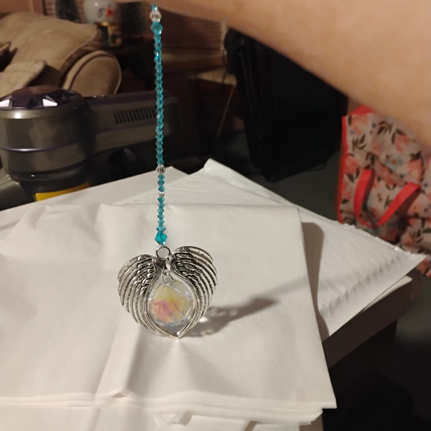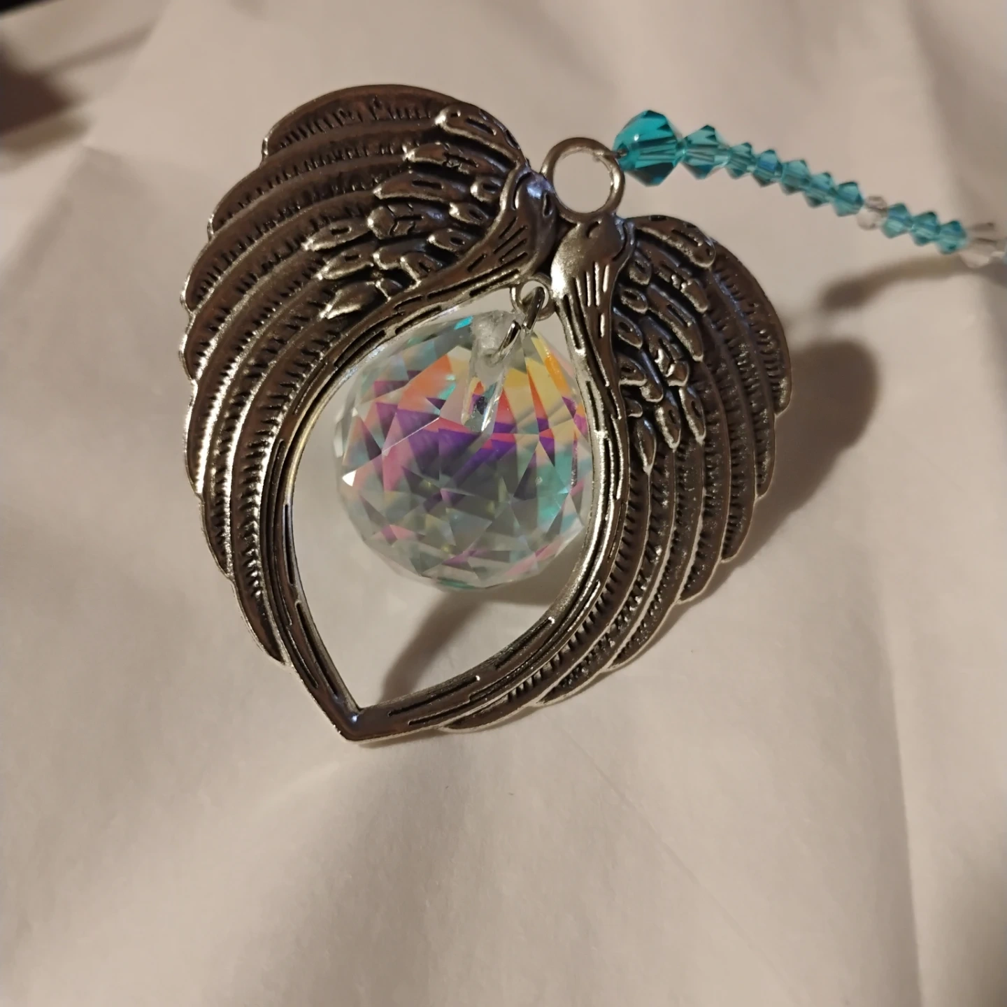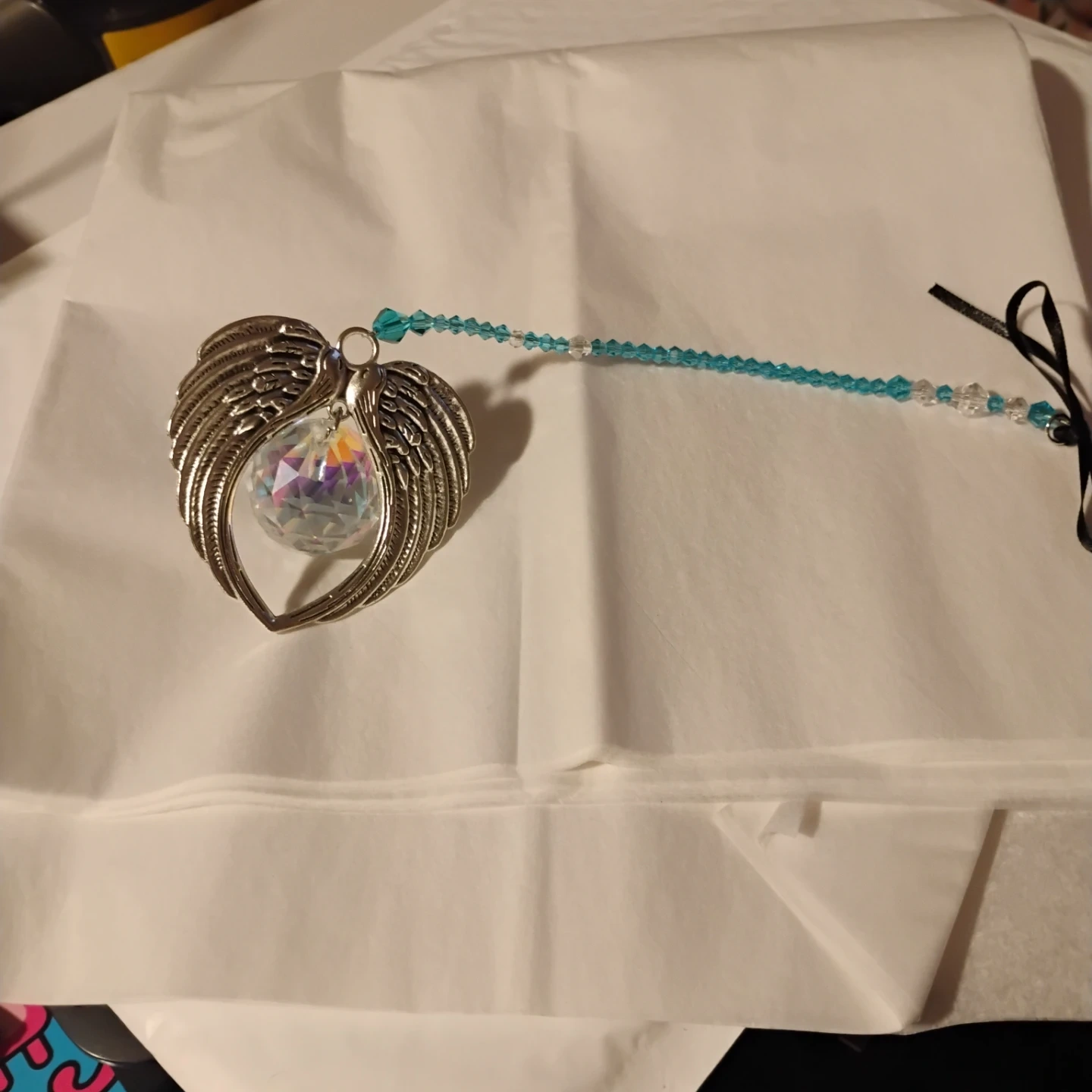 Angel wing ornament with a faceted crystal. It hangs from a beaded string and a black ribbon tie. It's a beautiful accent piece!