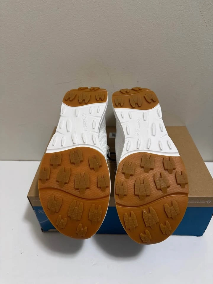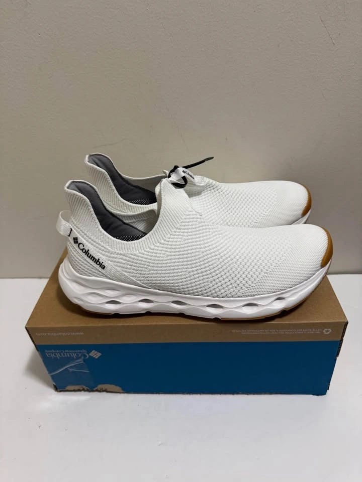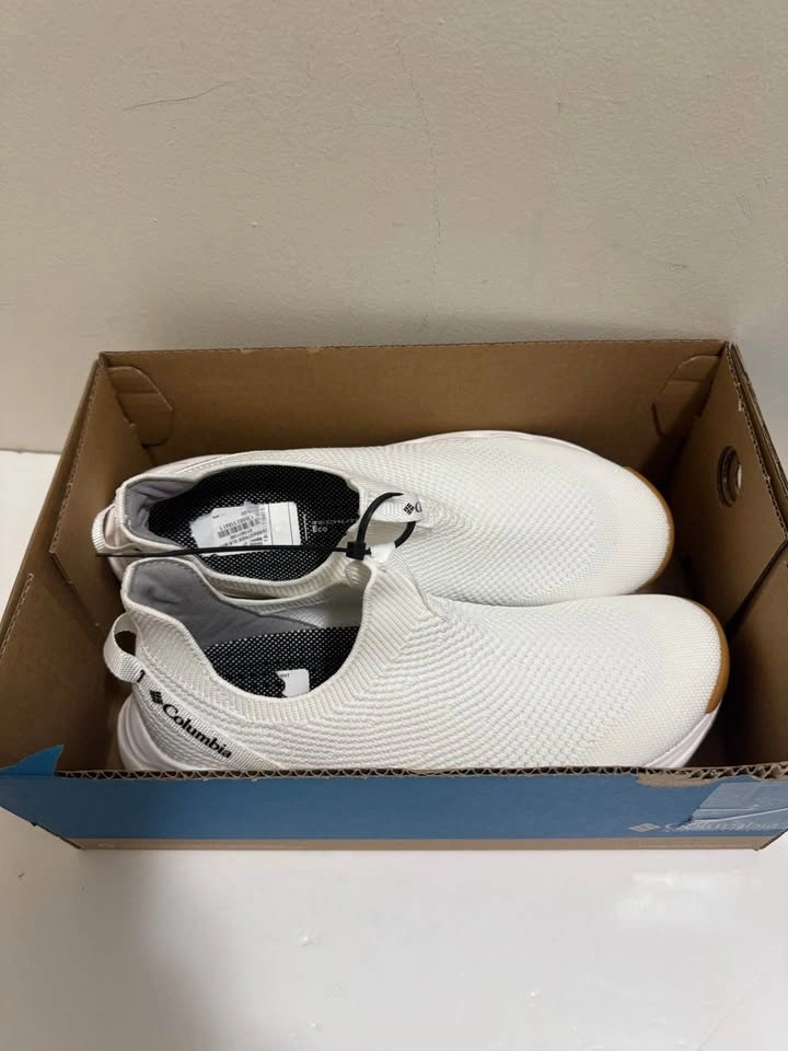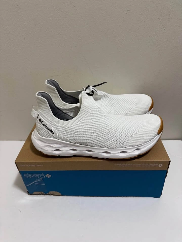 Fresh Columbia white slip-on shoes with a knit upper. White soles with brown accent at the toe and heel. Comes in the original box. Pick up only. Located near Brampton Gateway Terminal and Shopper World Mall Brampton. Address provided upon scheduled pickup confirmation. Cash only.