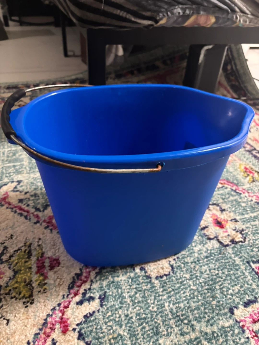 This is a blue 10 litre pail. It's made of plastic and has a metal handle with a black grip. Perfect for carrying water or other household tasks!