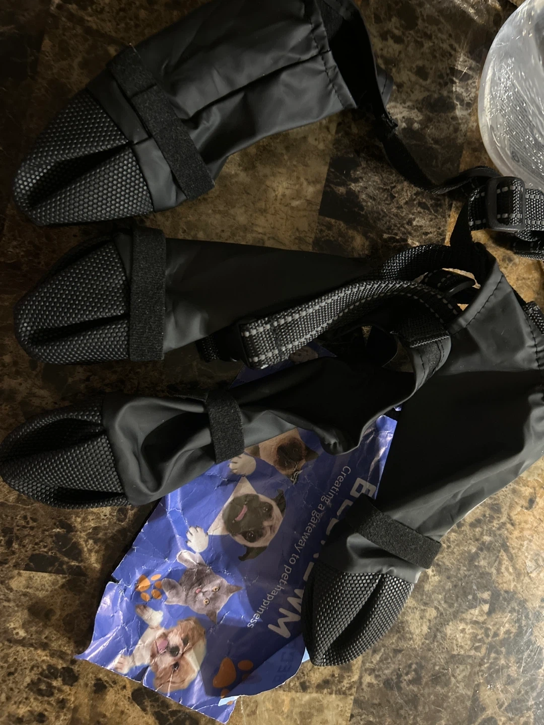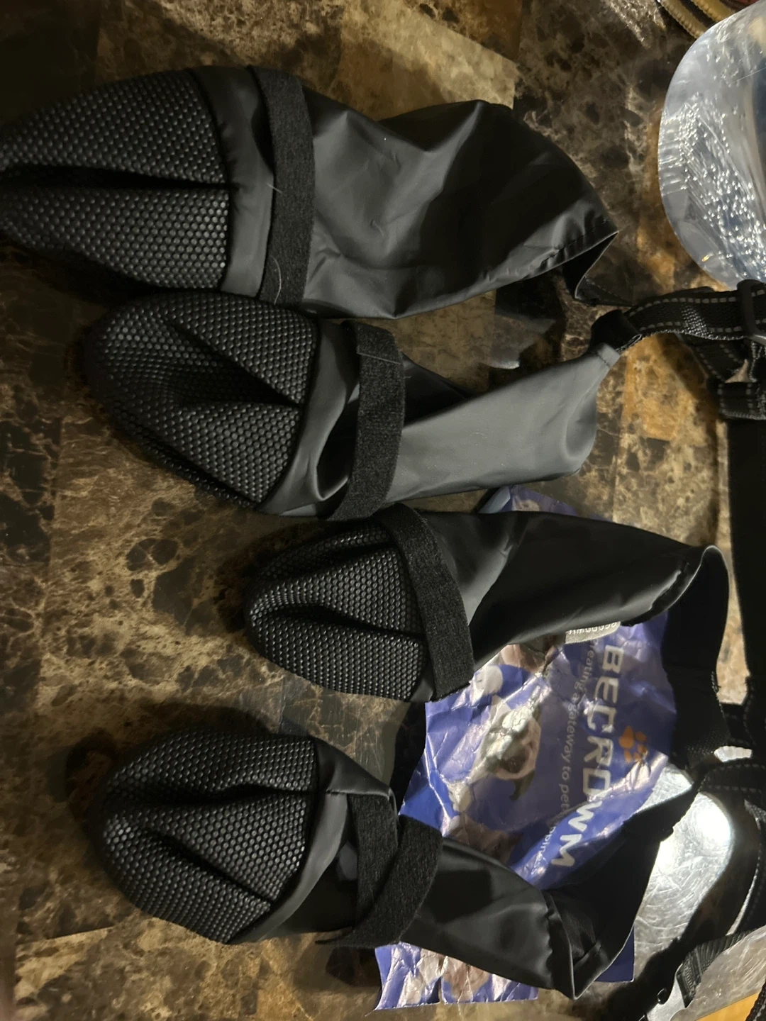 I’m selling a new Set of four black dog boots with adjustable velcro straps. These boots are made of durable nylon and have rubber soles for protection. Ideal for protecting paws from hot pavement, ice, or rough terrain.