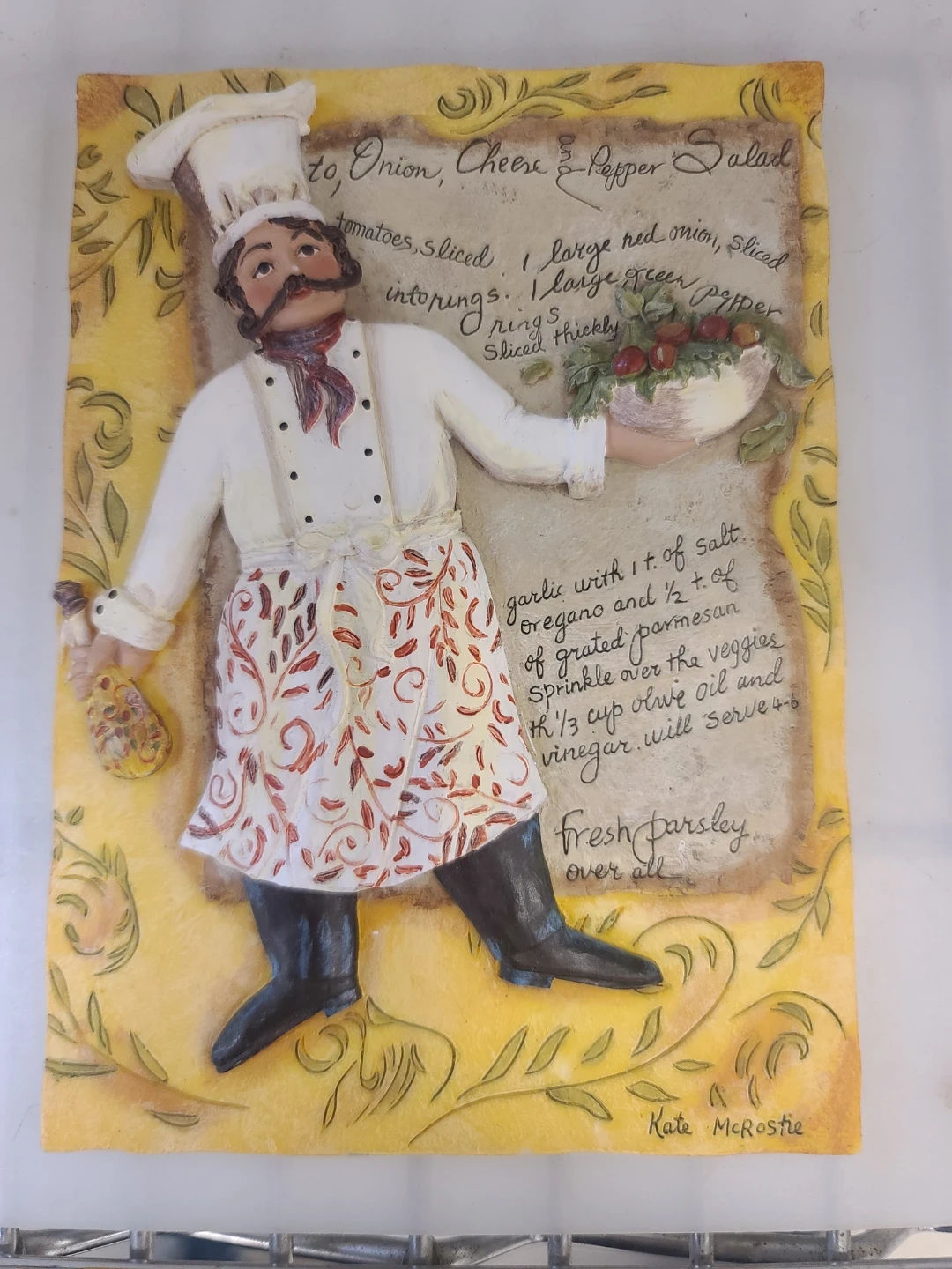 This is a decorative wall art piece featuring a chef and a recipe for Onion, Cheese & Pepper Salad. It's signed by the artist, Kate McRostie. The artwork depicts ingredients and instructions for a salad. It includes a recipe for a salad that serves 4-6 people.