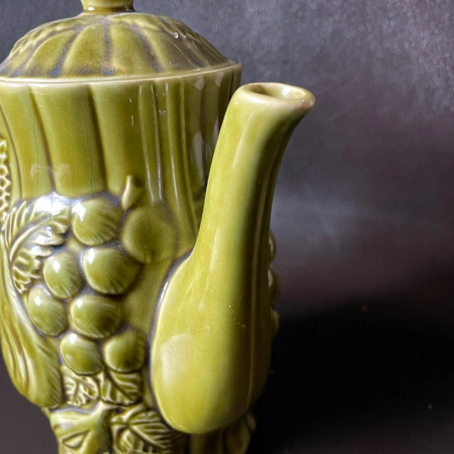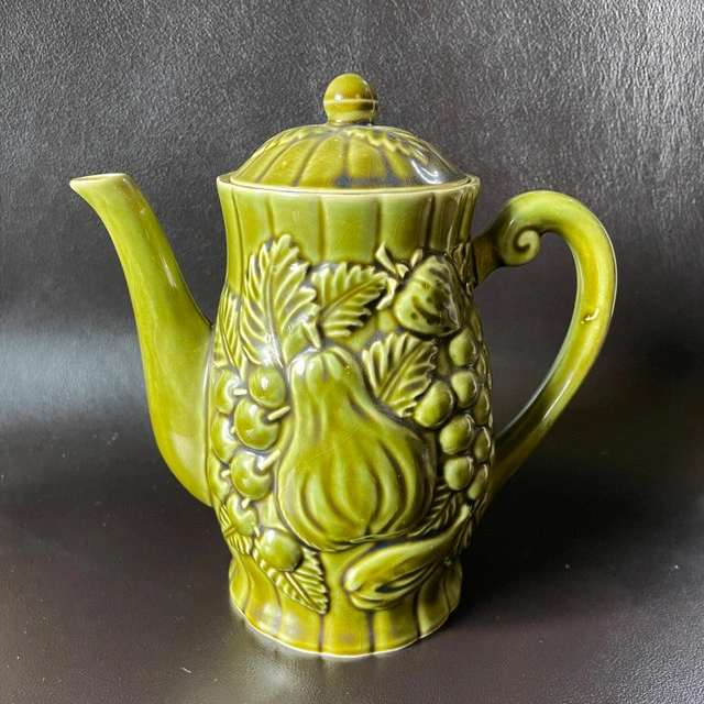 Selling a Vintage Japanese Avocado Green Ceramic Teapot with Embossed Pears and Grapes Approx. 7-1/2" high. Inside pristine. Marked Japan on bottom. No chips or cracks or crazing. Great gift! Asking $25. Available for pick up in the Broadview/Danforth area. Contact-free porch pick up. Check out my other great stuff!
