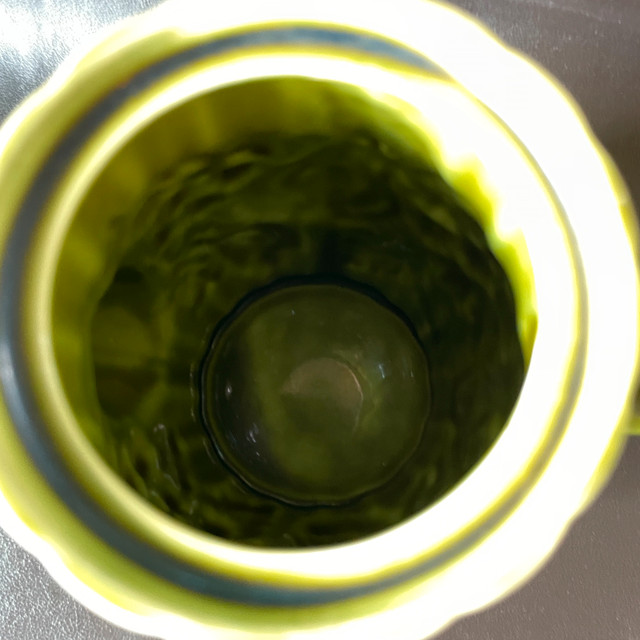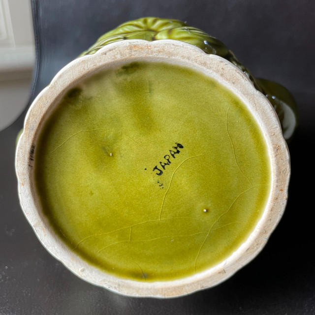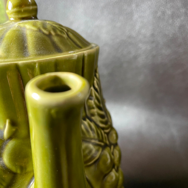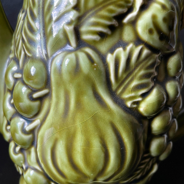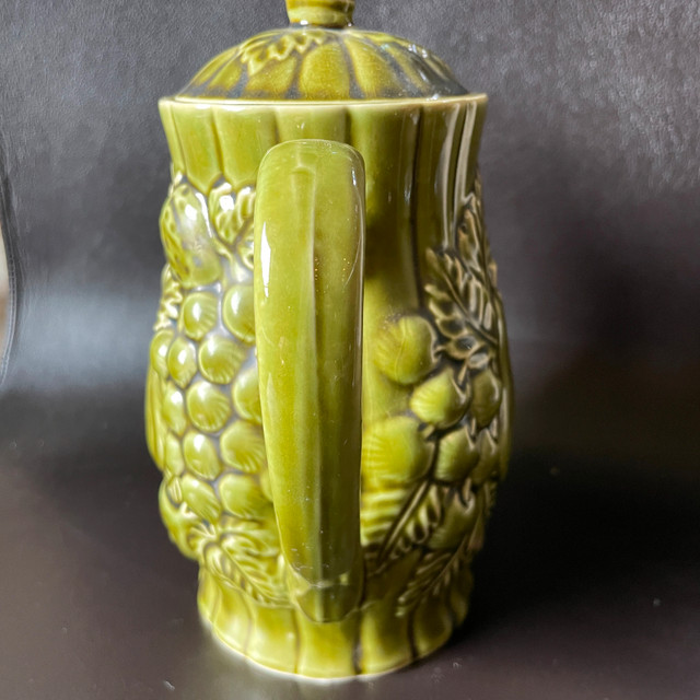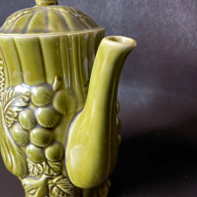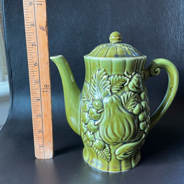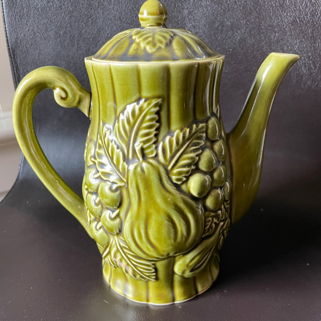 Selling a Vintage Japanese Avocado Green Ceramic Teapot with Embossed Pears and Grapes Approx. 7-1/2" high. Inside pristine. Marked Japan on bottom. No chips or cracks or crazing. Great gift! Asking $25. Available for pick up in the Broadview/Danforth area. Contact-free porch pick up. Check out my other great stuff!