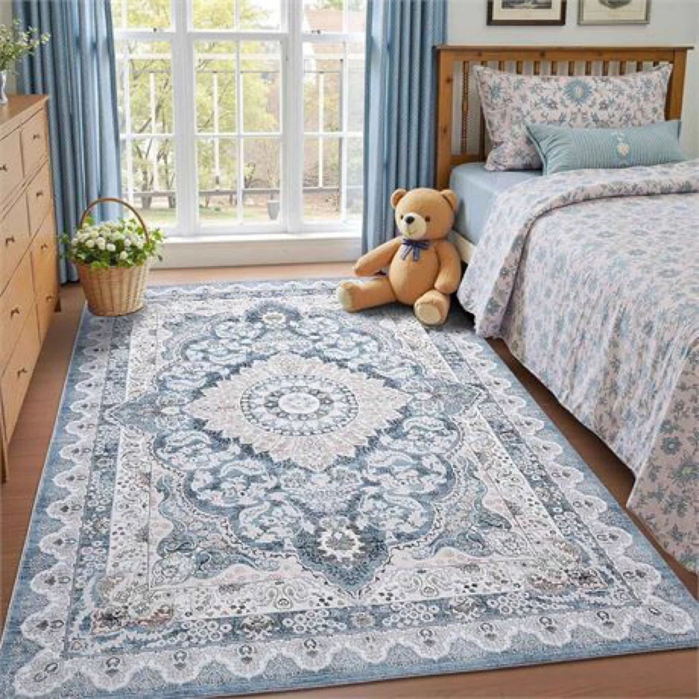 This area rug features a beautiful traditional medallion design with reinforced edges and a non-slip backing. It's made with a soft material that's comfortable underfoot. This rug's classic pattern makes it a nice addition to any bedroom or living space!