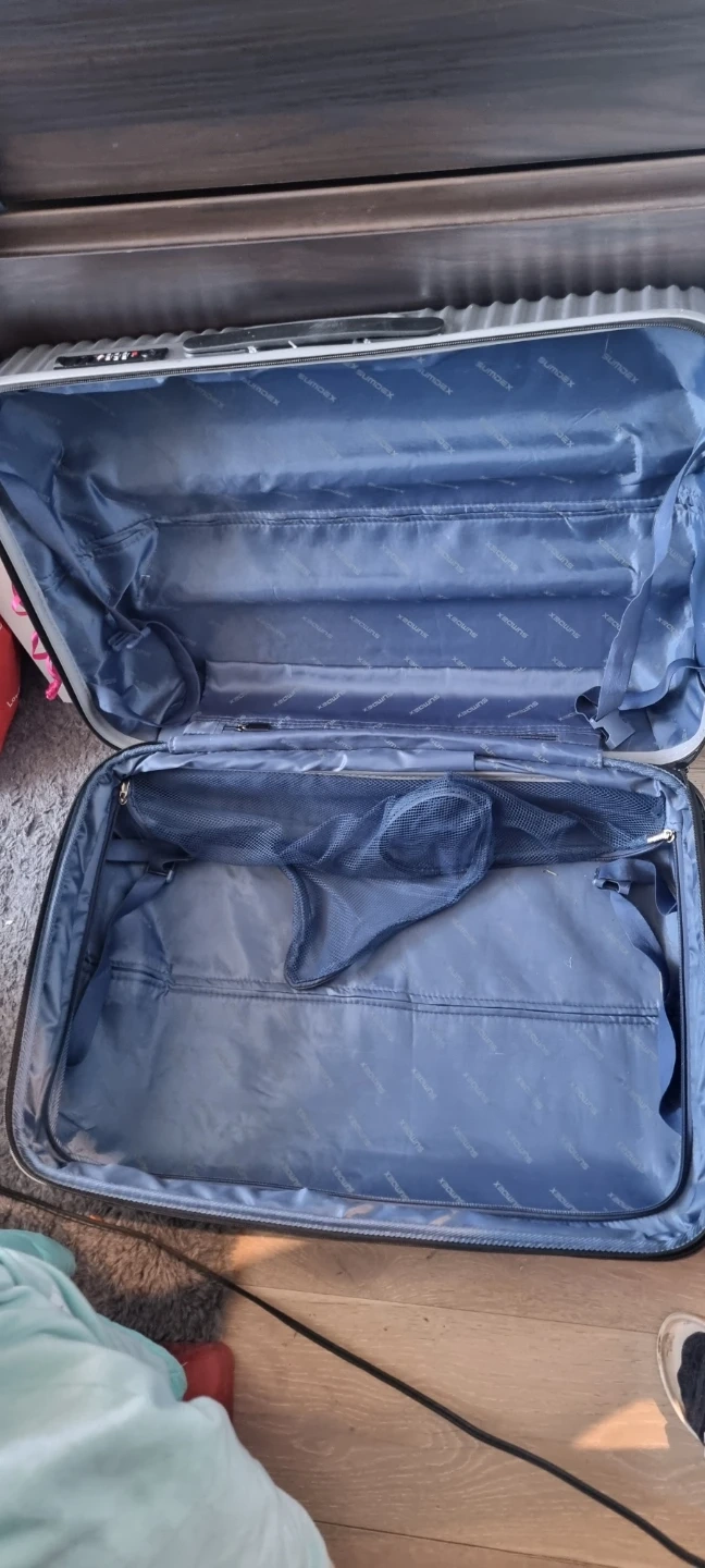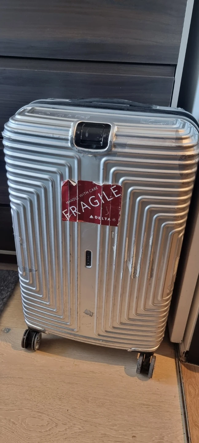 This is a silver hard-shell spinner suitcase. It features a durable exterior and a zippered compartment inside. The suitcase has four spinner wheels for easy manoeuvring. It's ready for your next trip!