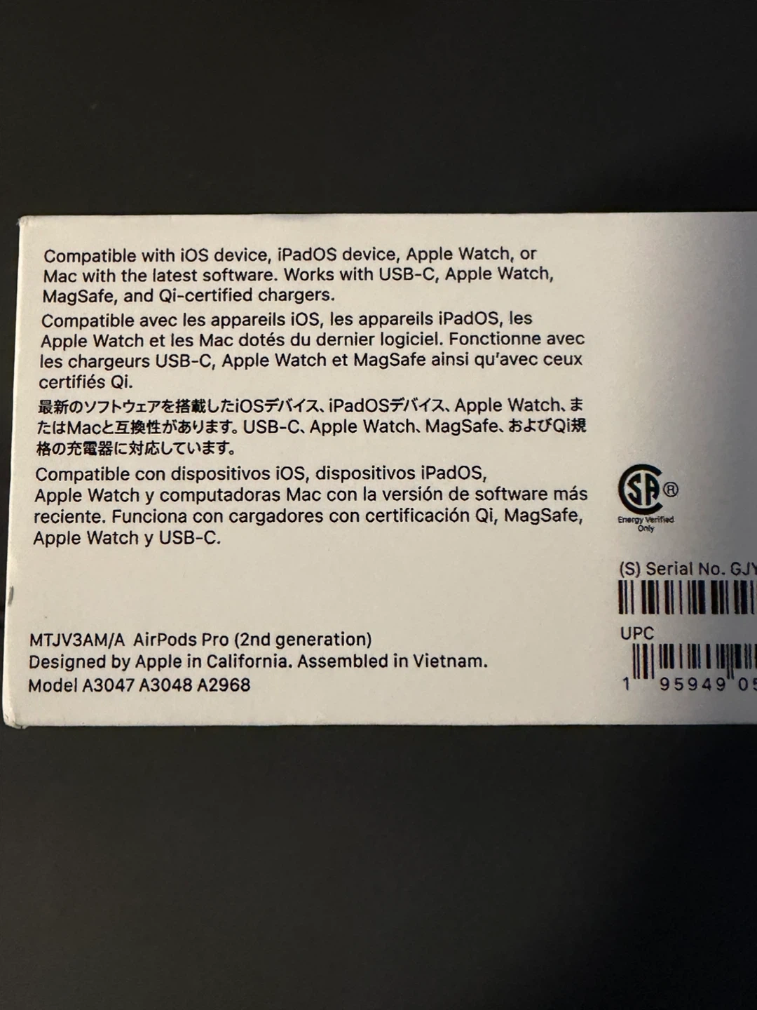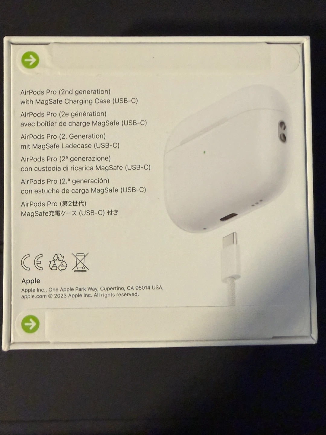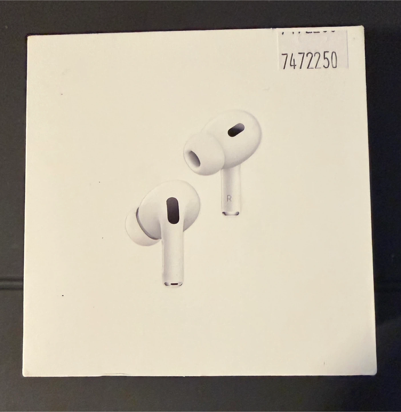 NIB Apple AirPods Pro (2nd generation) with MagSafe Charging Case (USB-C). Designed by Apple in California. Assembled in Vietnam. Model A3047 A3048 A2968. Compatible with iOS, iPadOS, Apple Watch, and Mac devices. Includes USB-C charging cable.