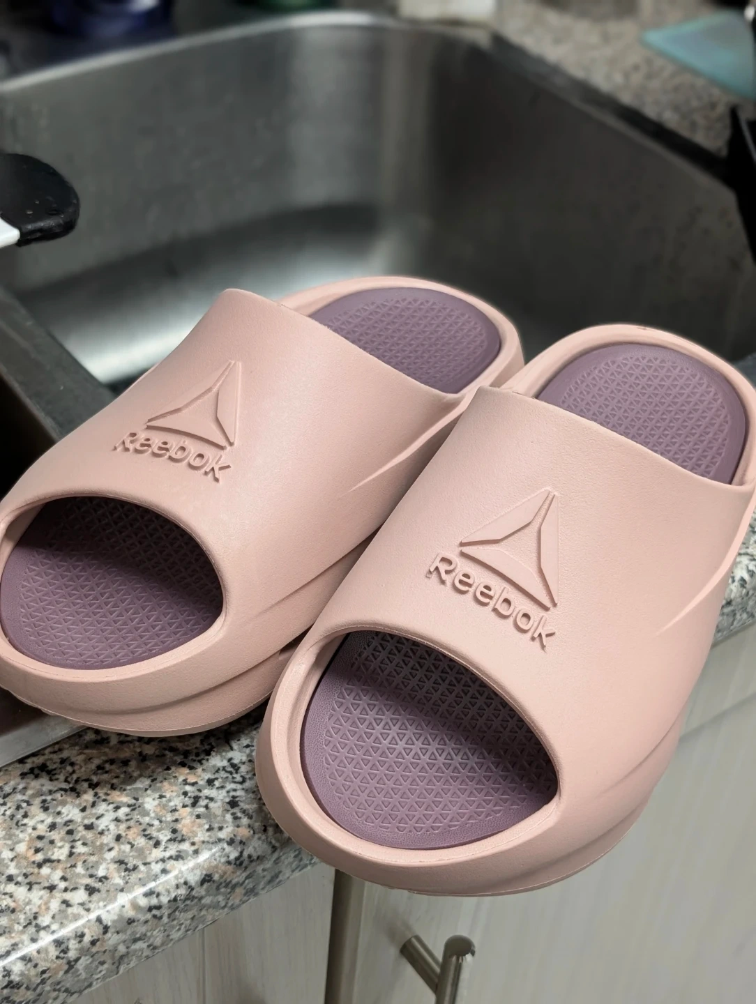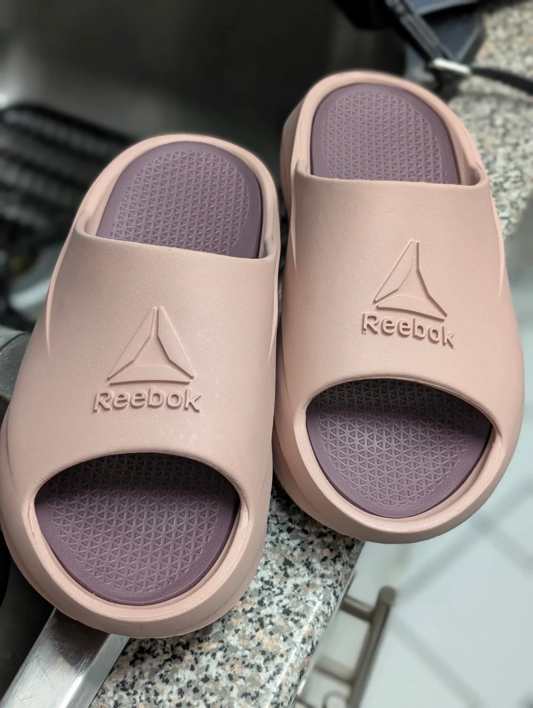 Comfortable Reebok slide sandals in a lovely pink colour. These slides are size 9 (US Women's). They're made with a durable, easy-to-clean material. Perfect for post-workout relaxation or casual wear!