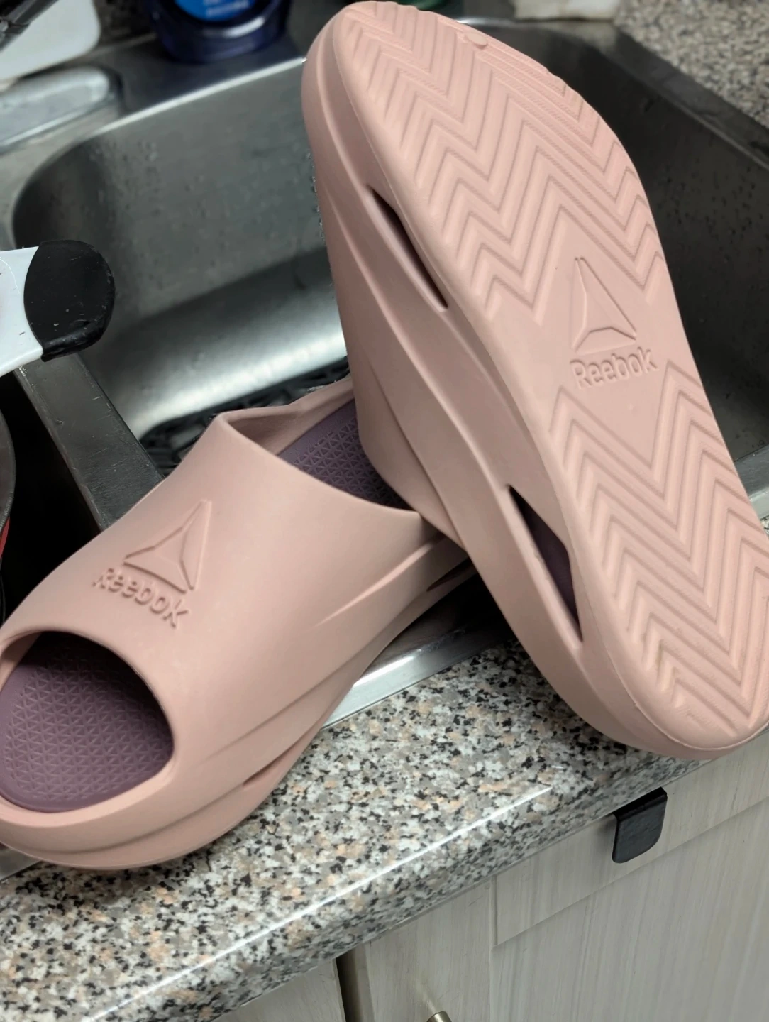 Comfortable Reebok slide sandals in a lovely pink colour. These slides are size 9 (US Women's). They're made with a durable, easy-to-clean material. Perfect for post-workout relaxation or casual wear!