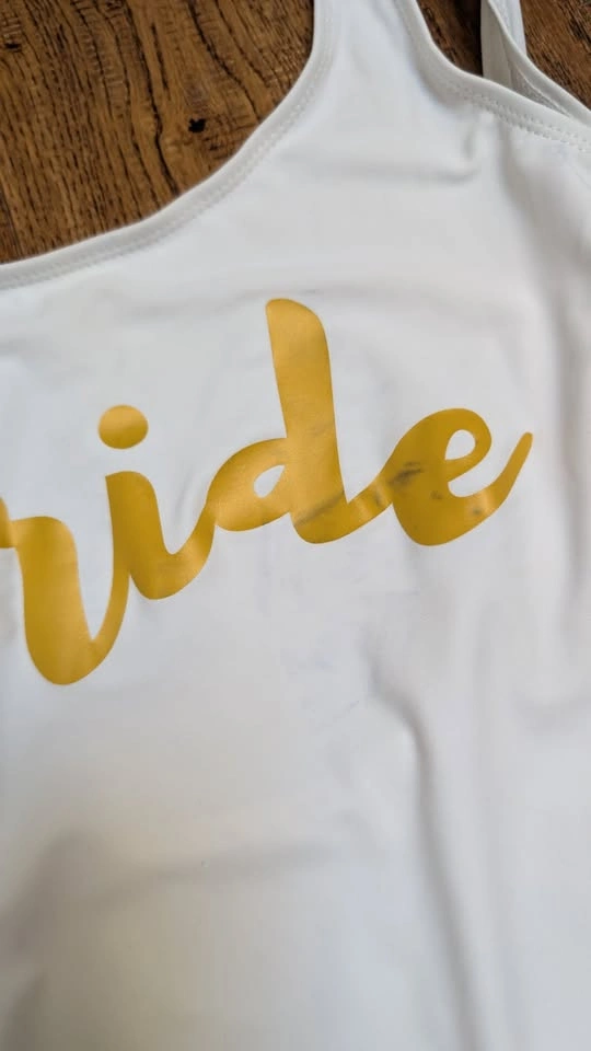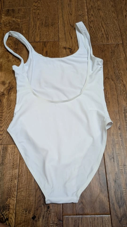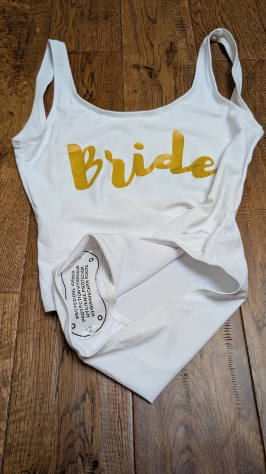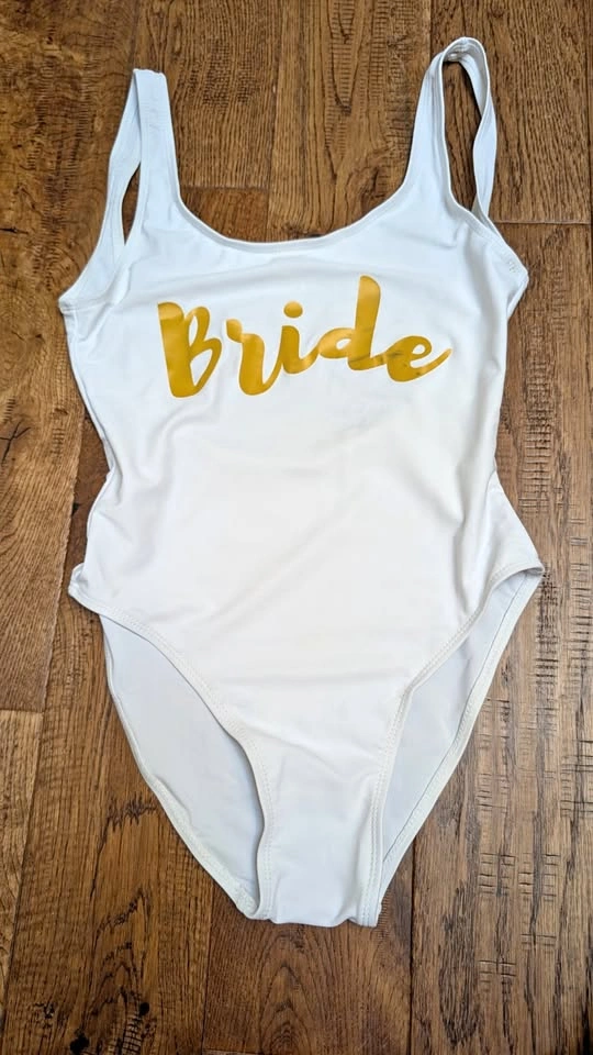1) White One piece with Bride in gold on the front. Low back. Note there is slight colour transfer on the de of Bride (see photos)