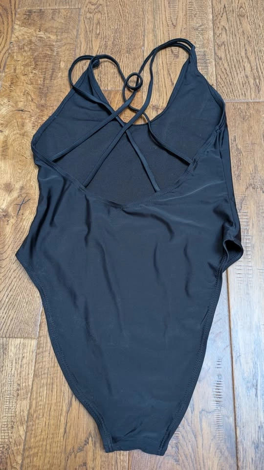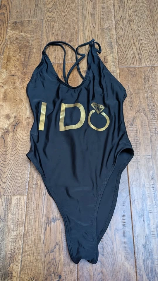 2) Black One piece with "I do" in Gold on the front. Strappy cross back.