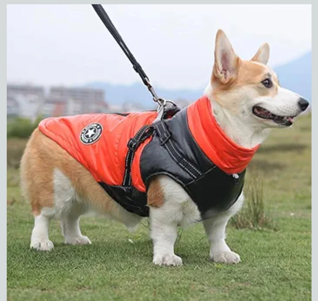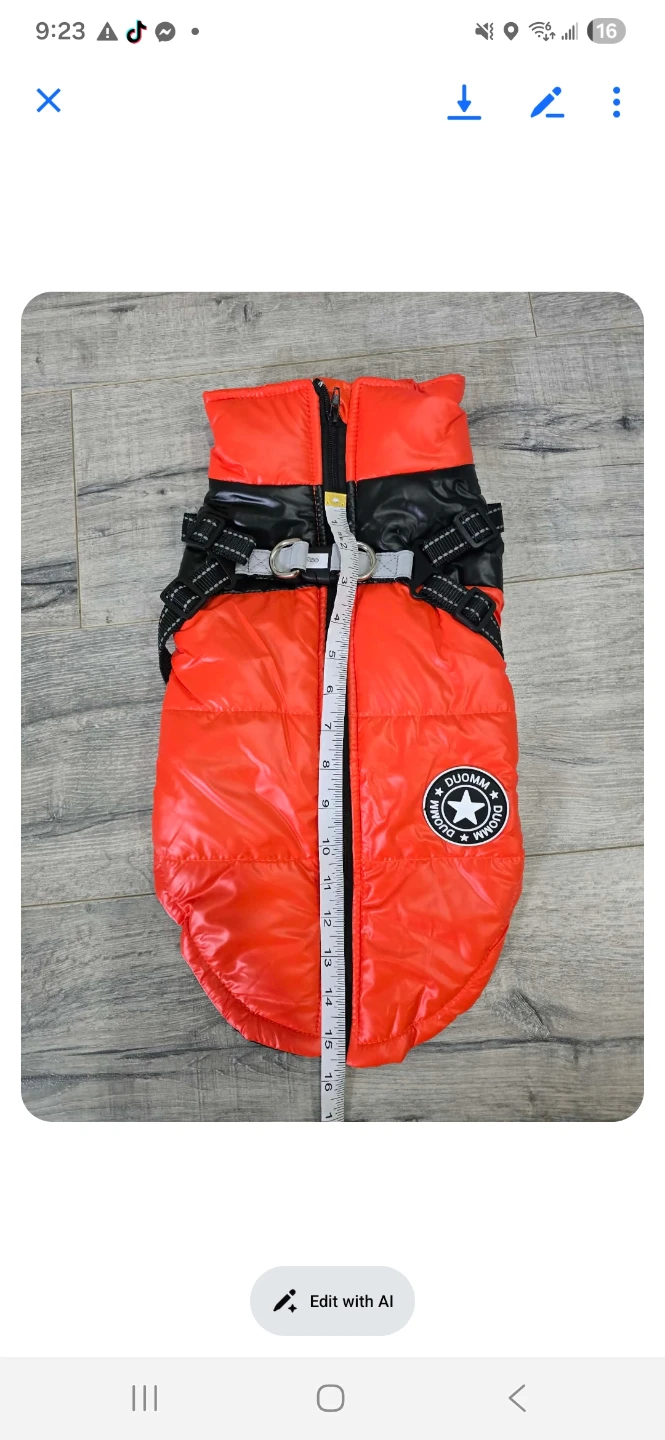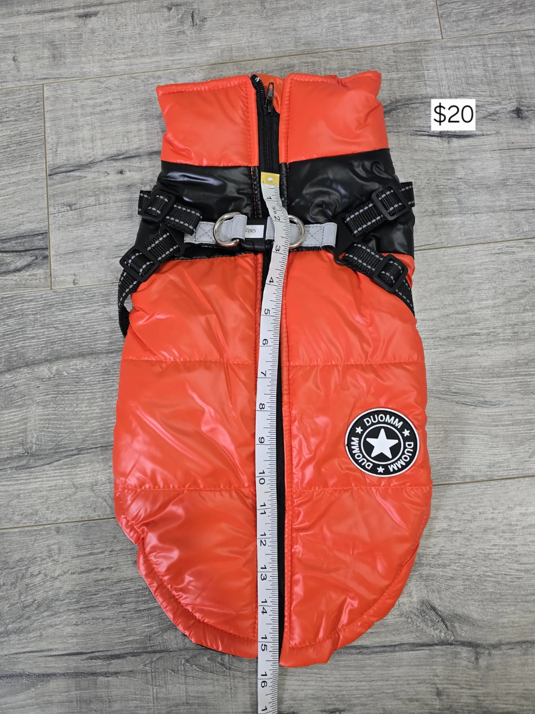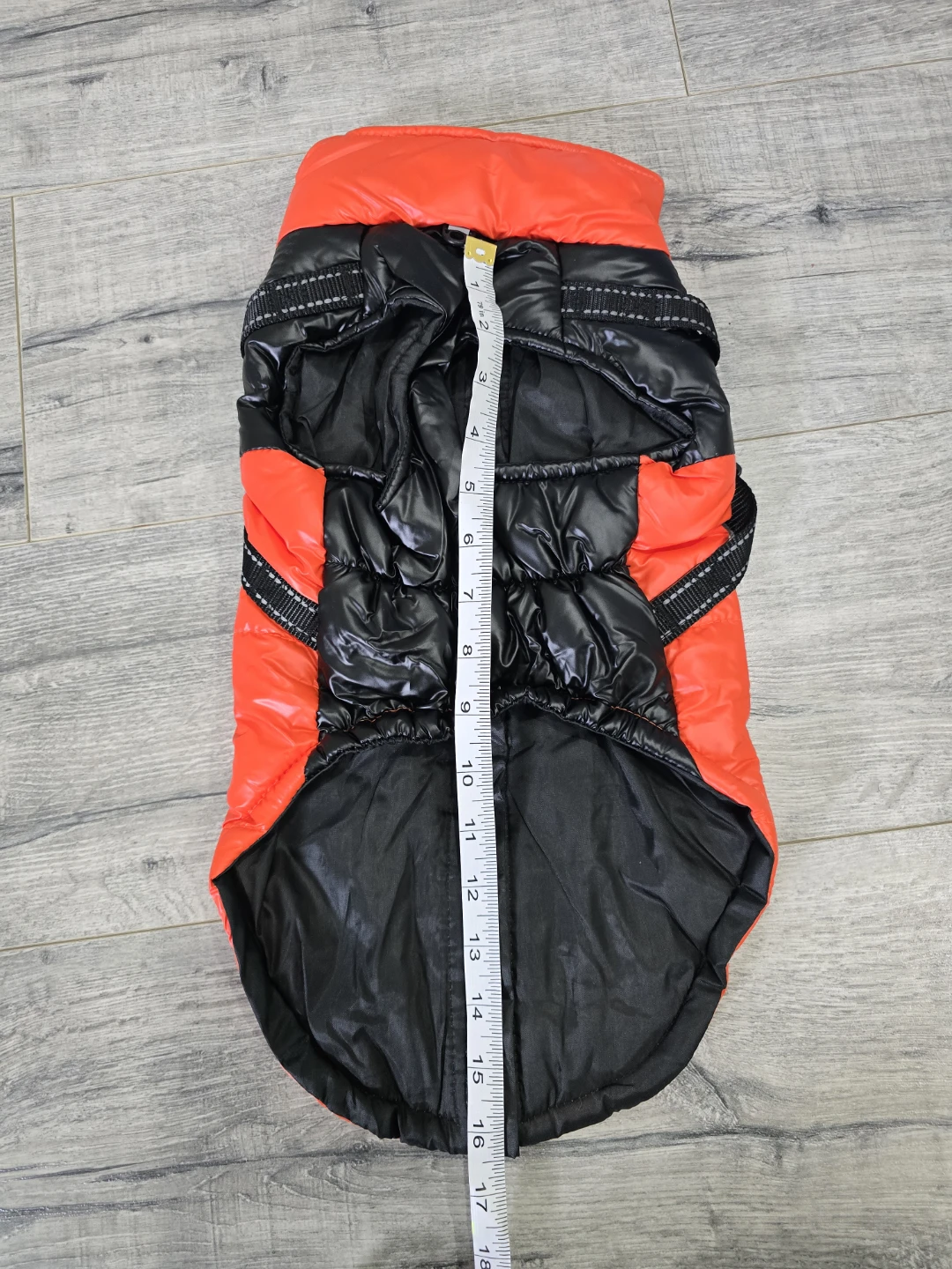 Keep your furry friend warm and stylish with this DUOMM winter dog jacket! It's orange and black with adjustable straps for a snug fit. Measures approximately 16 inches long. Great for cold weather walks!