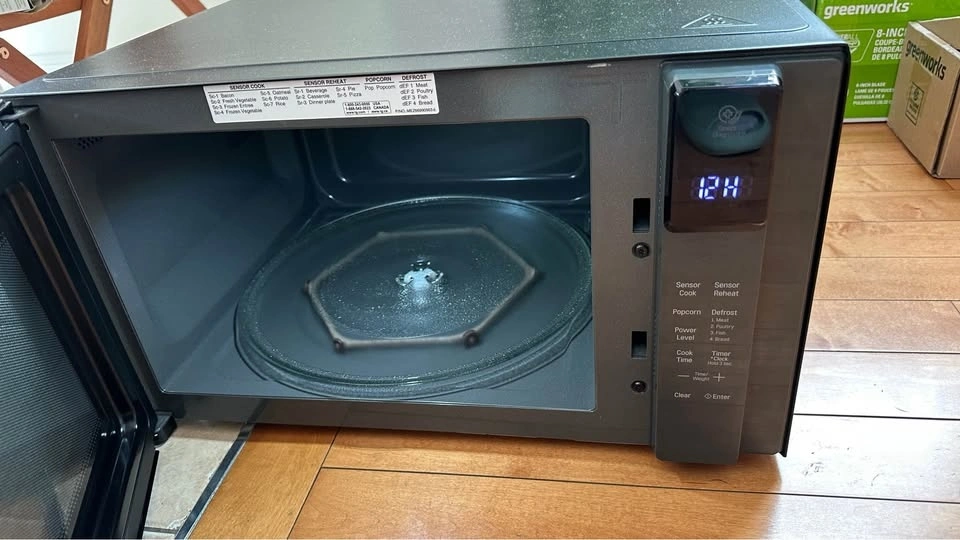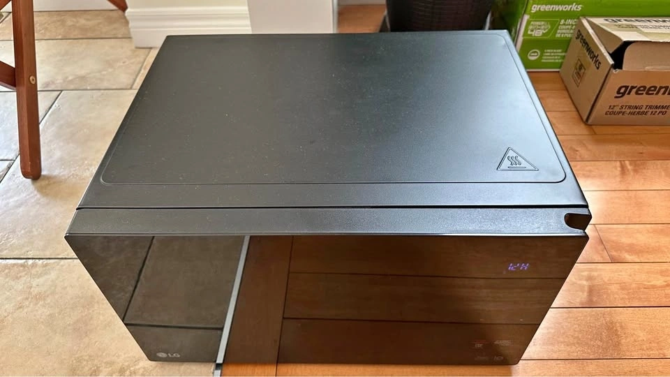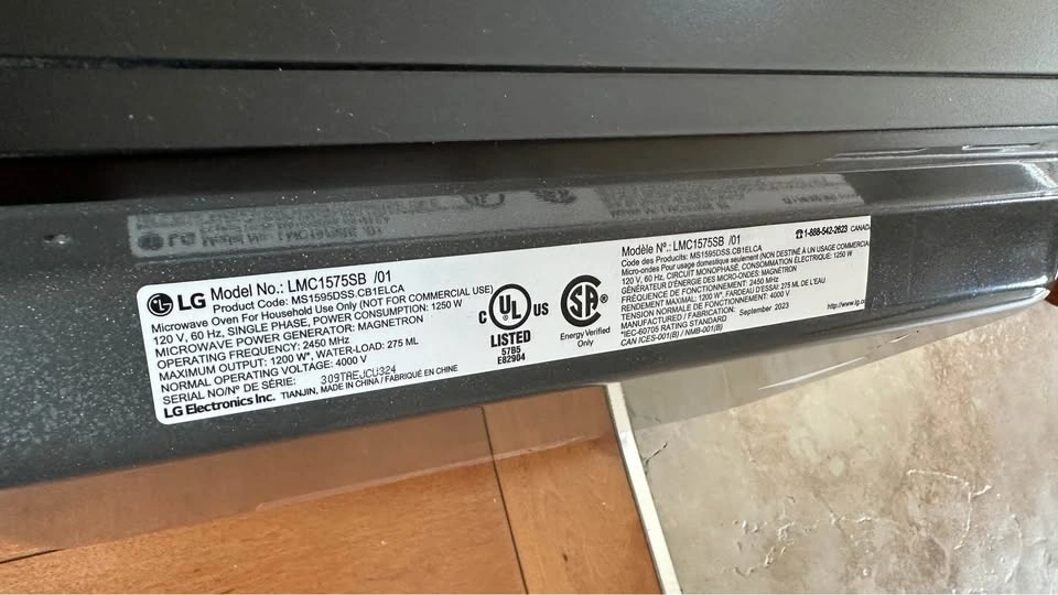 Modern LG microwave oven, model LMC1575SB. Features Smart Inverter technology for even cooking. Sleek black finish with a glass front. Includes a glass turntable. 1200W power output. Great for any kitchen. Public pick up at Summit Park.