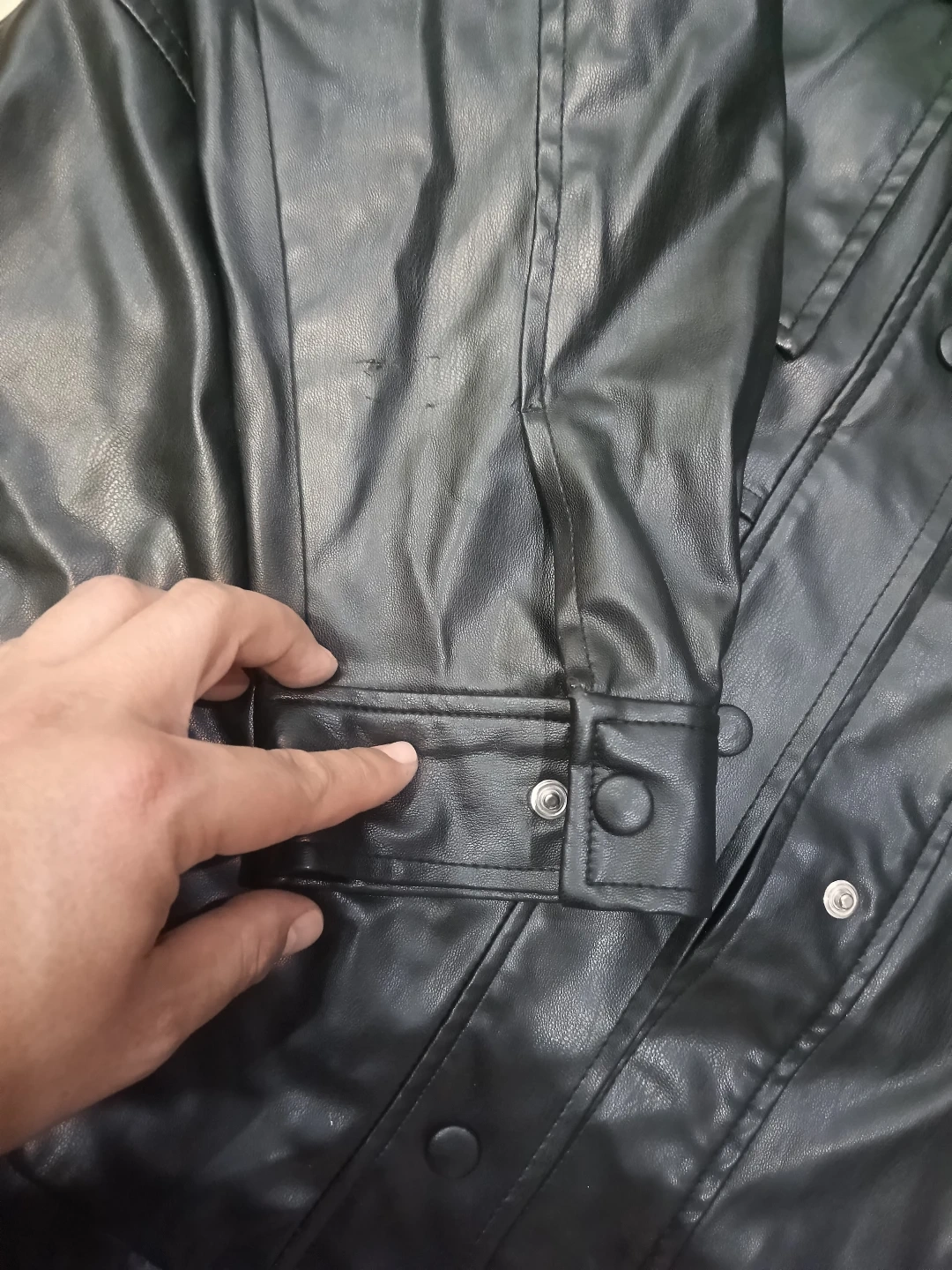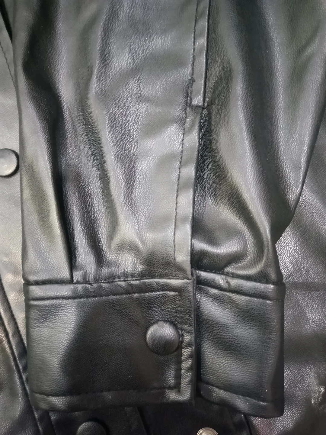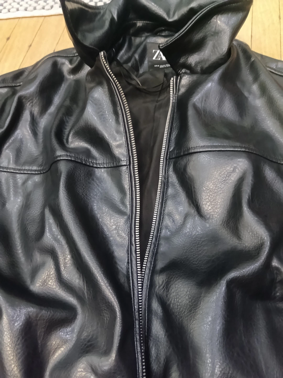 This is a black faux leather jacket from Zara. It's a size medium with snap button cuffs. The jacket features a zip-up front and a collared neckline. Looks sharp!