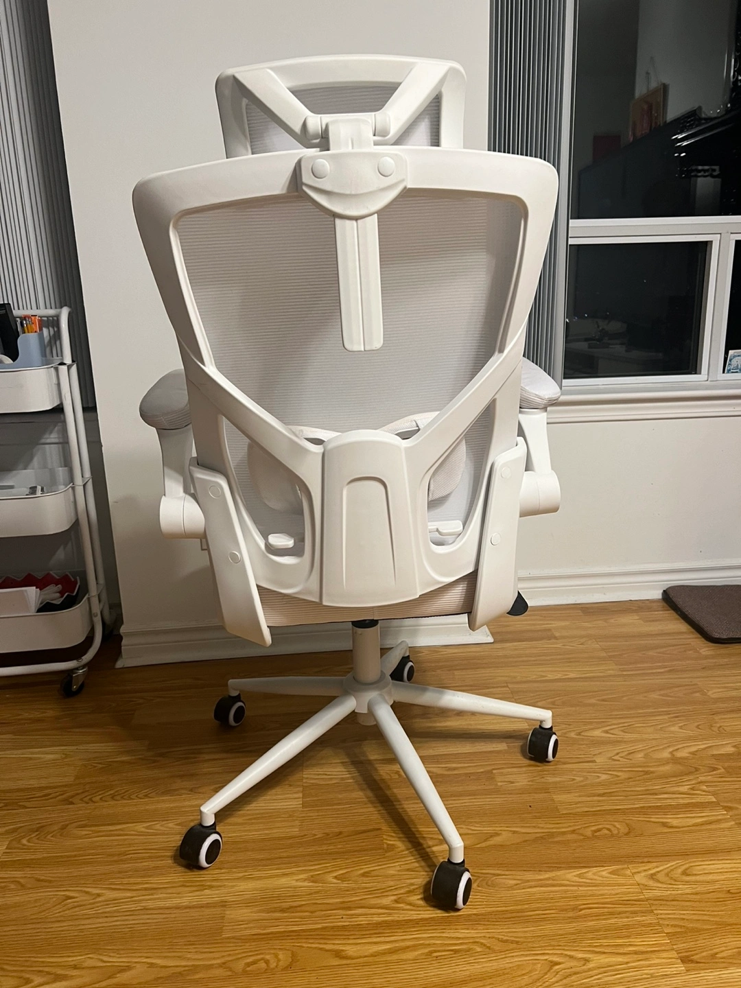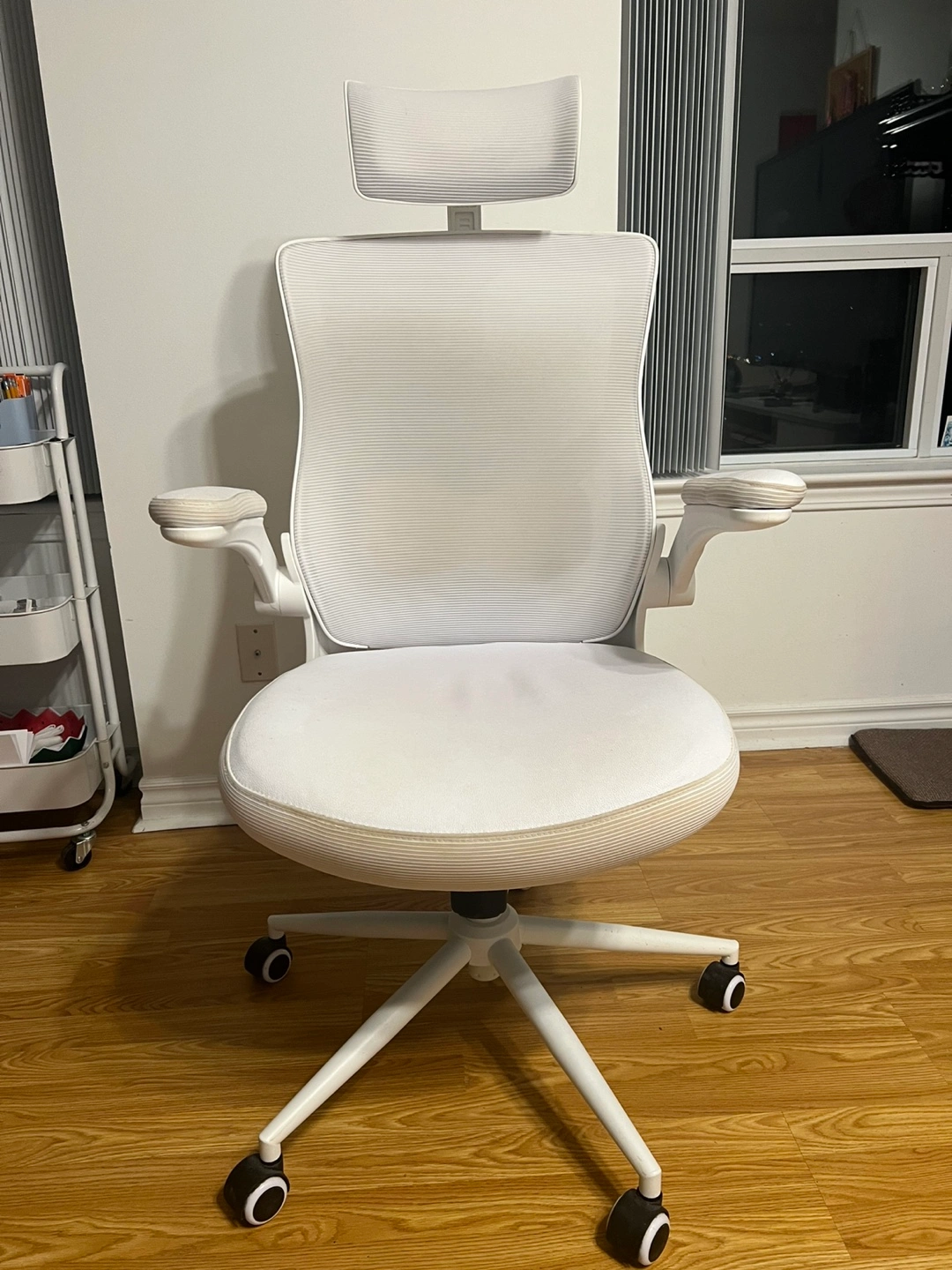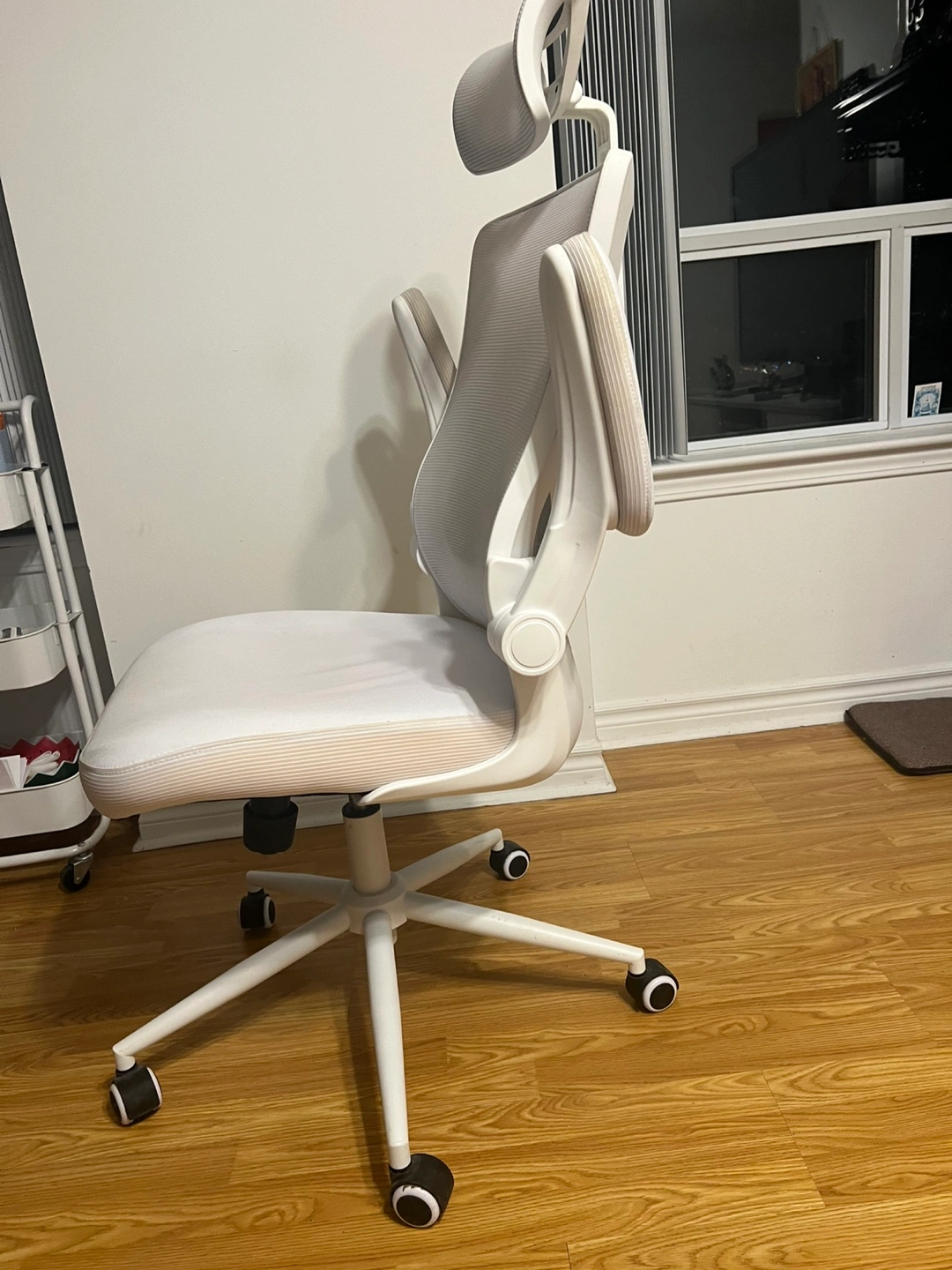 Comfortable and adjustable office chair. Features adjustable mesh back, adjustable headrest, and armrests. Great for gaming, home, or office use. White colour.