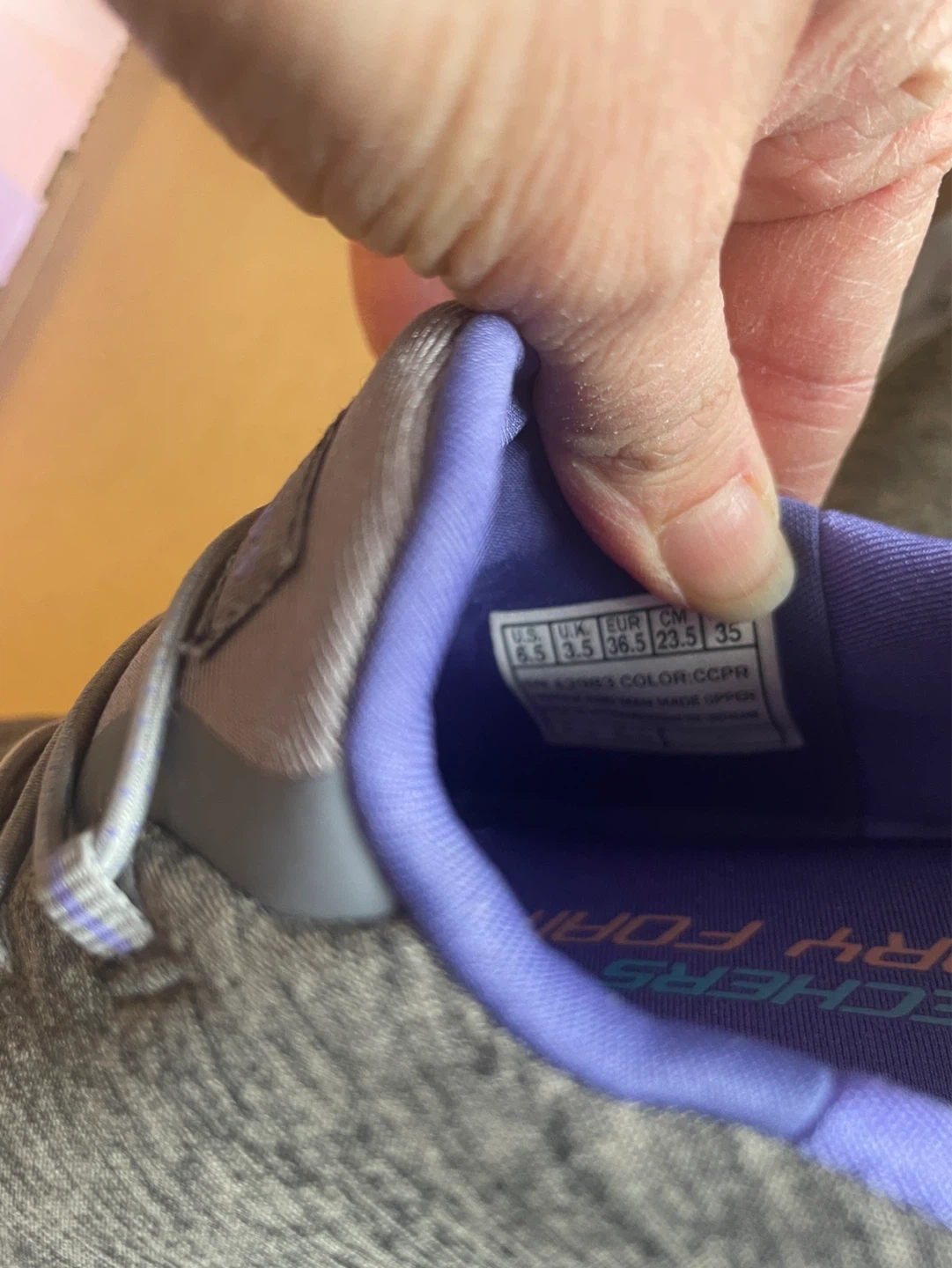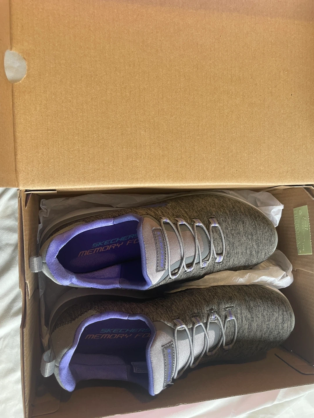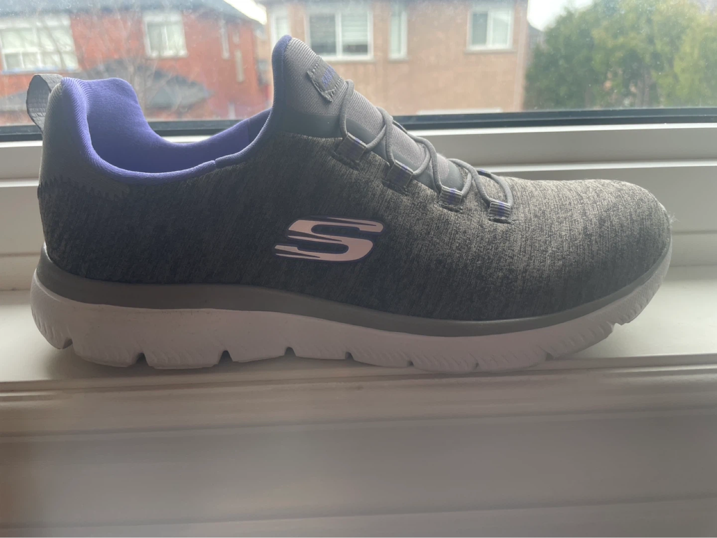 These Skechers sneakers are grey with purple accents and feature memory foam insoles for comfort. They're slip-on style with elastic laces. Excellent for daily wear or light exercise!