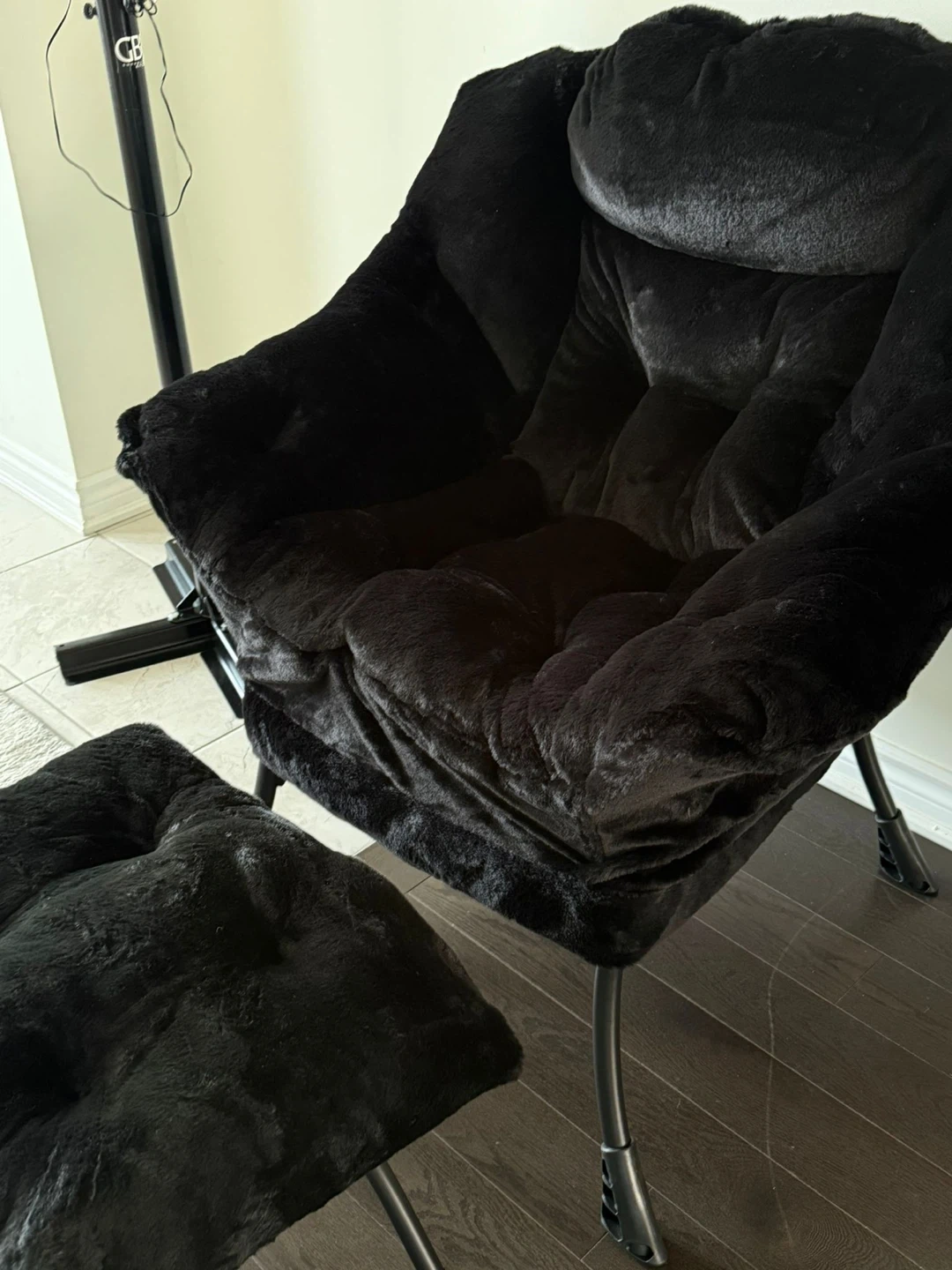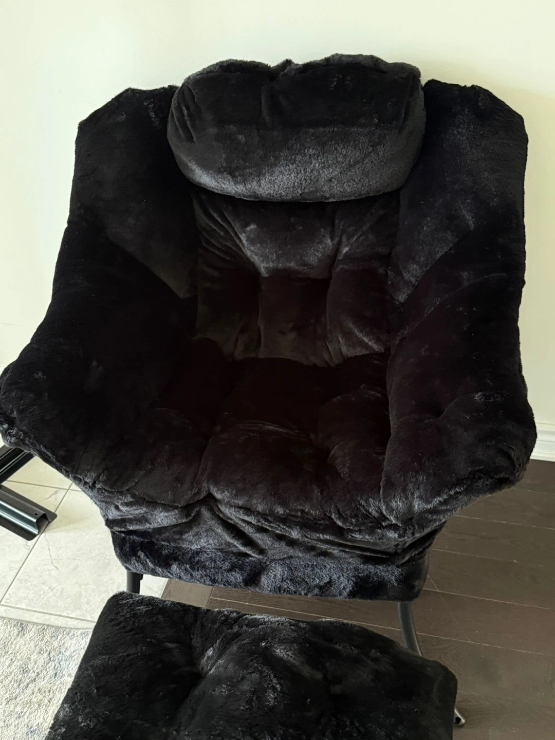 Comfy black accent chair upholstered in soft faux fur. It includes a matching ottoman for extra comfort. This chair is designed for relaxing and lounging.