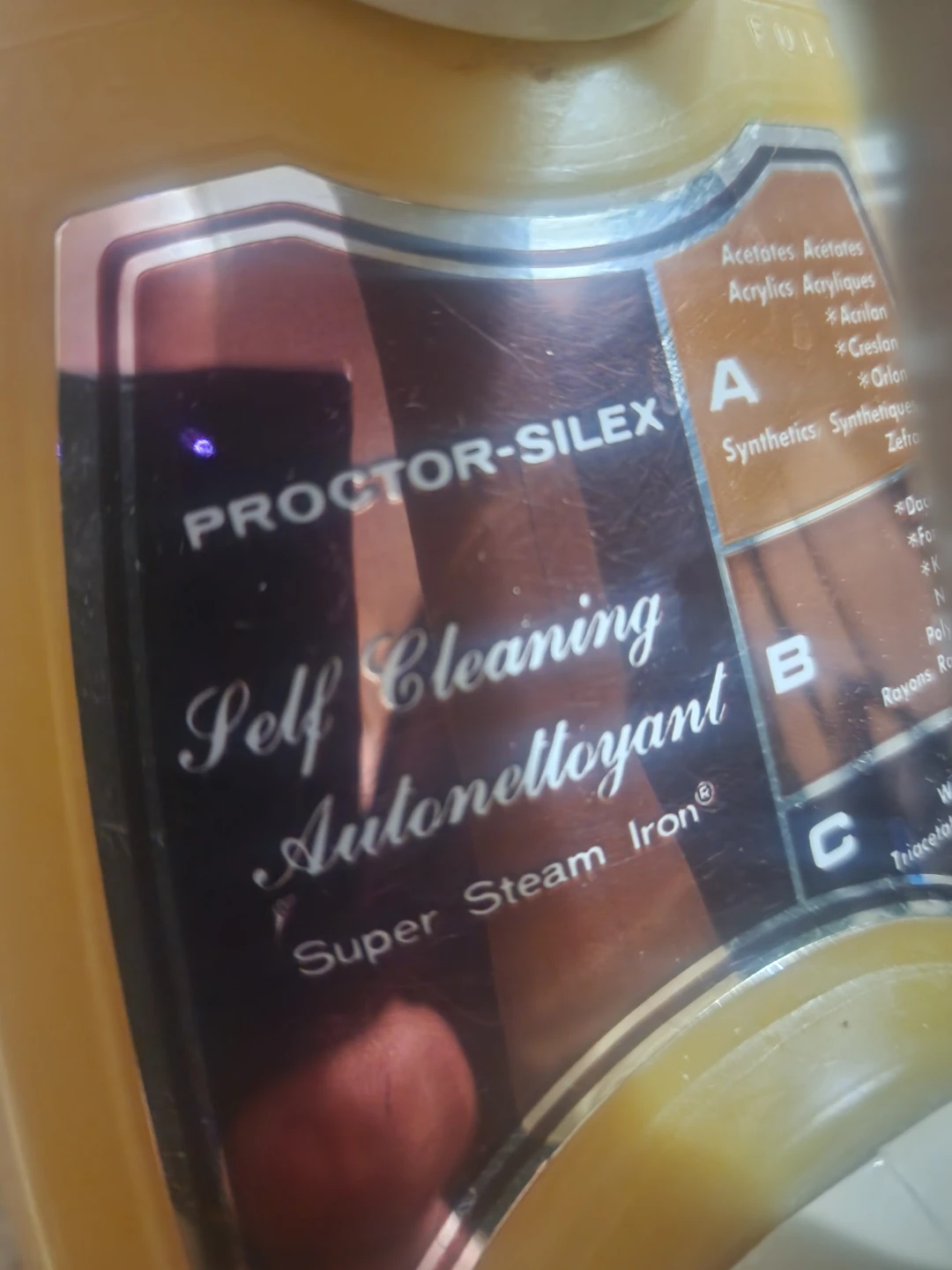 Selling a vintage Proctor-Silex self-cleaning super steam iron. It has settings for different types of fabrics like synthetics, rayons, and wool. A cool piece for anyone into vintage appliances!