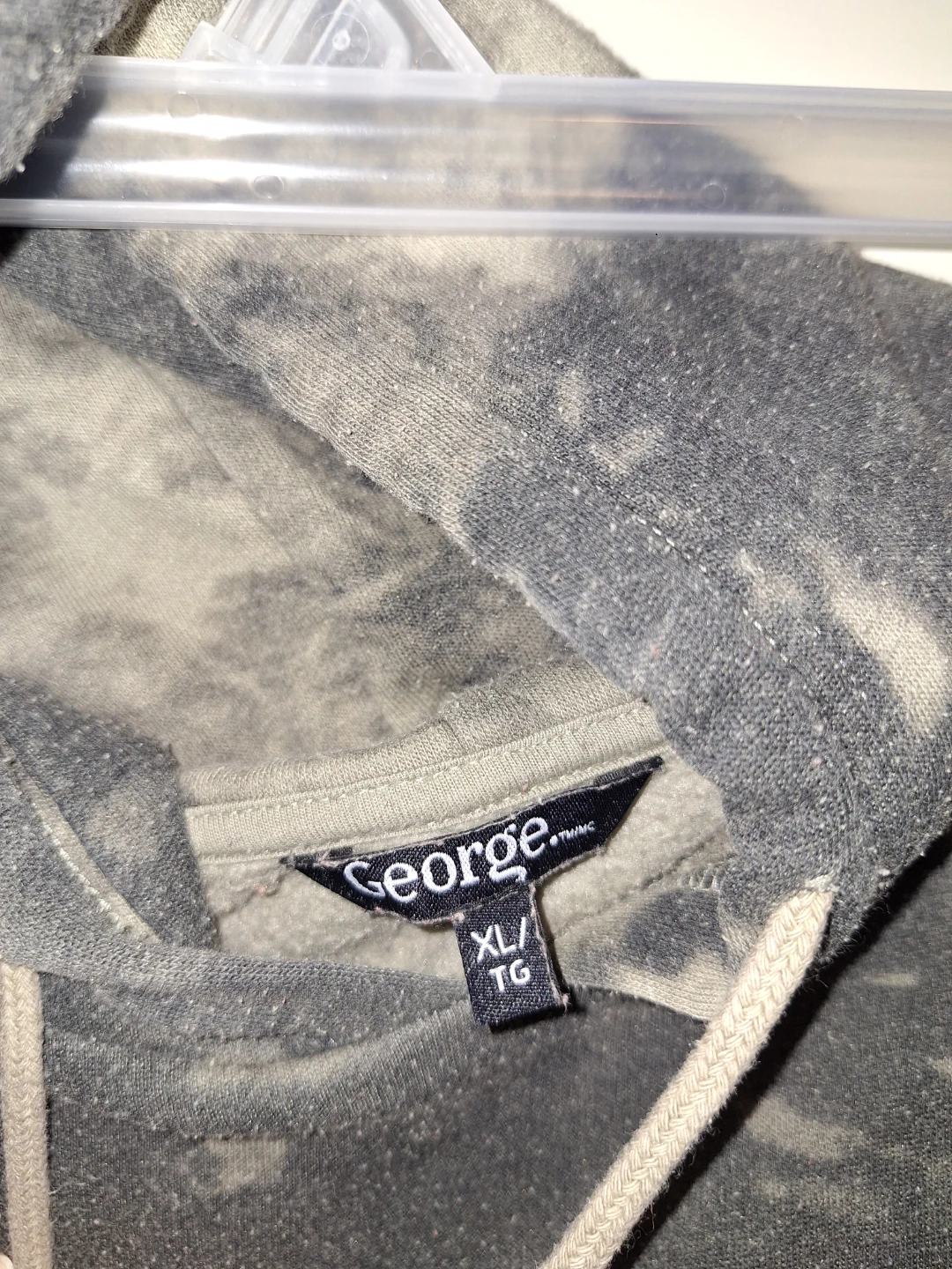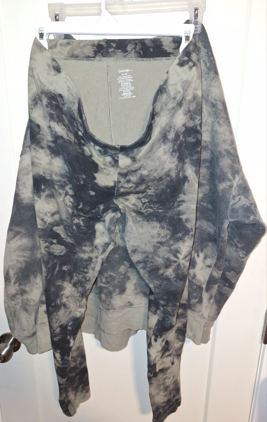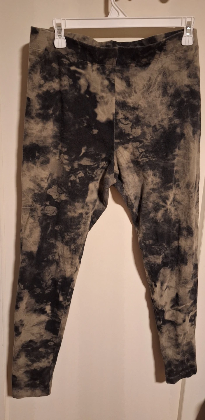 Selling a comfy George hoodie and leggings set in size XL. The set features a unique tie-dye pattern in grey and black. Perfect for lounging around the house or running errands! There are little fuzzies here and there on the set but still in great condition. No holes, No rips.