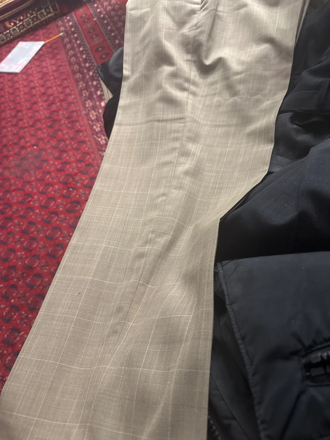 These Pierre Cardin dress pants are made from 100% polyester. They feature a subtle plaid pattern and a size 36 waist. Washable for easy care.