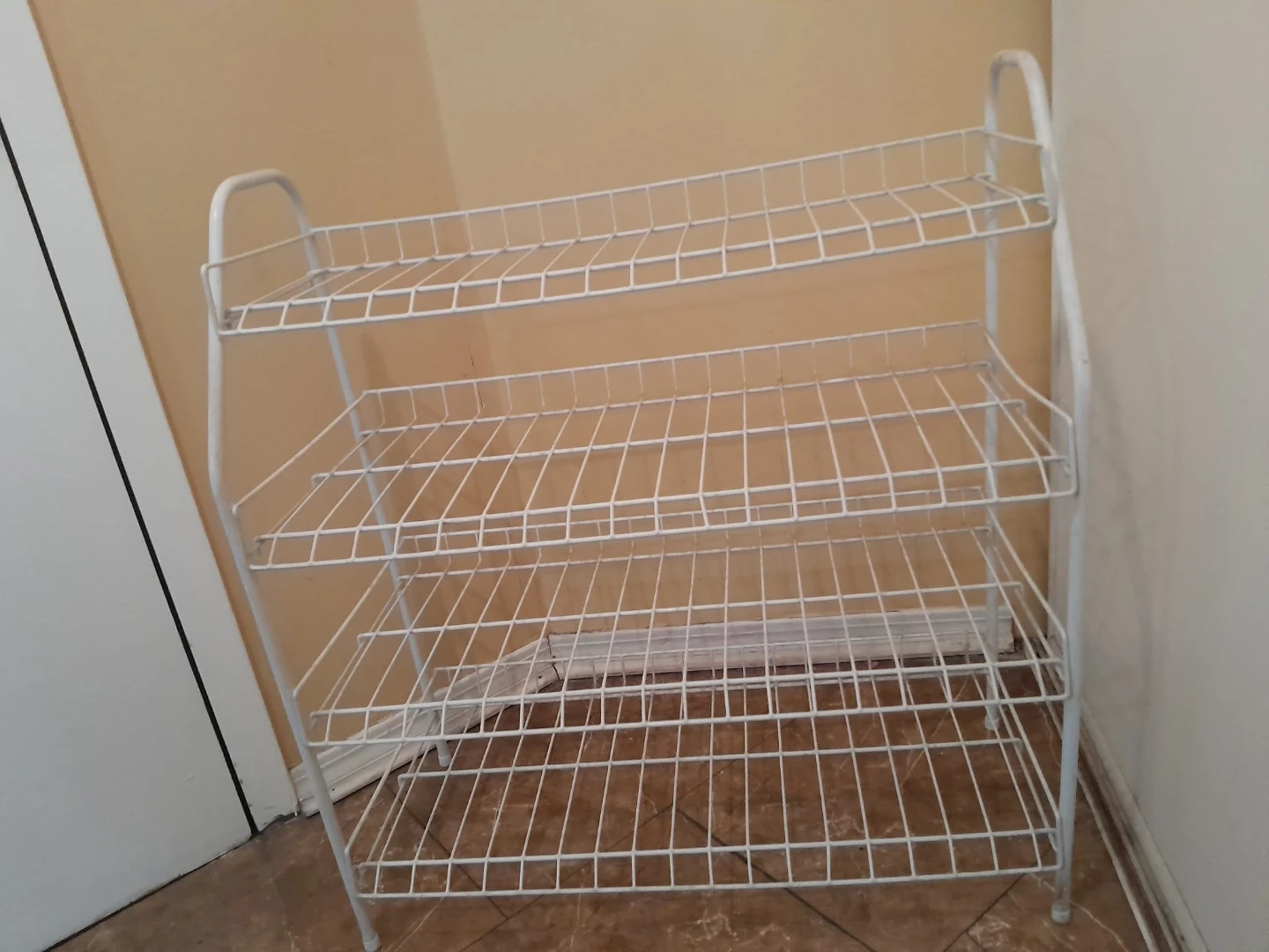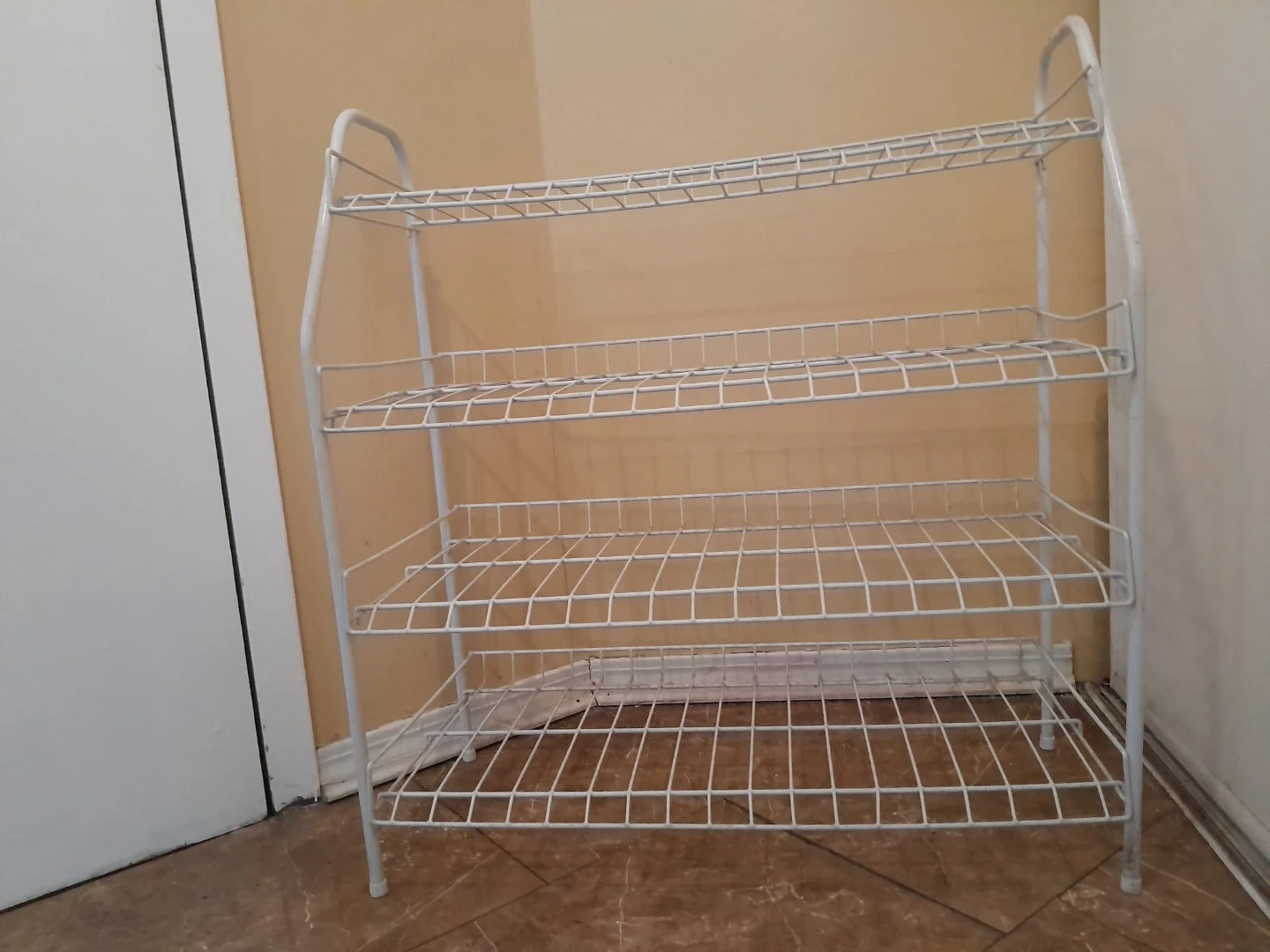 A metal shoe rack with 4 tier shelf on sale .Color white.In a good condition.No rust.Perfect for small spaces and easy to move around.Good for shoes or use it for any other small stacking household items ..Sturdy built.if interested plz msg for a pick up.