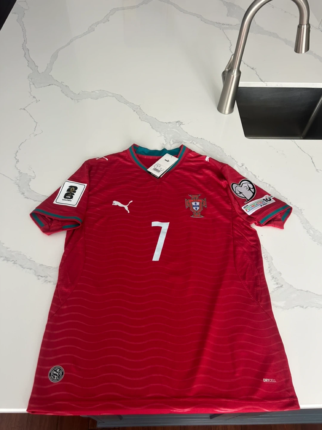 Pick up at 401 and Weston road . Top quality replica .This is a red home Puma soccer jersey featuring Cristiano Ronaldo's name and number 7. It includes the Portugal crest and various official patches, including FIFA Qualifiers and UEFA Foundation. The jersey is made with DryCELL technology for moisture-wicking. Perfect for any soccer fan!
