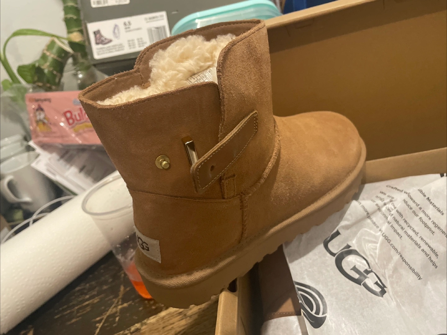 These boots have a short shaft and a light brown color. The boot is made of suede and has a buckle on the side. Perfect for winter weather, to keep your feet warm and relaxed after a long day.