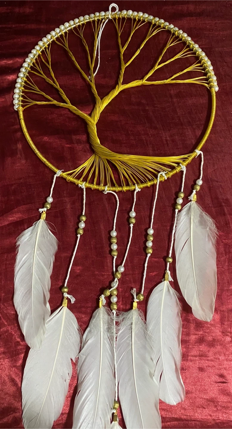 Handmade dreamcatcher featuring a gold wire tree of life design. It's adorned with white beads and feathers. Measures approximately 8 inches in diameter.
