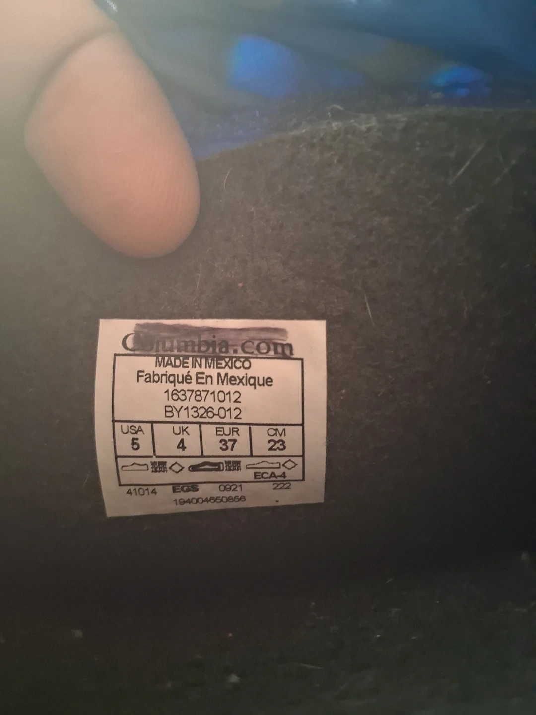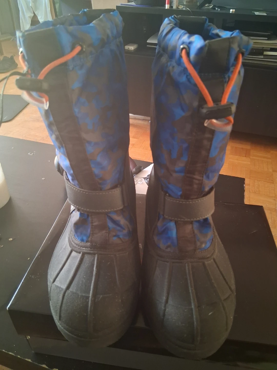 Youth Columbia snow boots in size 5 USA. These boots feature a blue and black camouflage pattern and a waterproof design. They're made to keep feet warm and dry during winter weather. Used 1-2 times. No box.