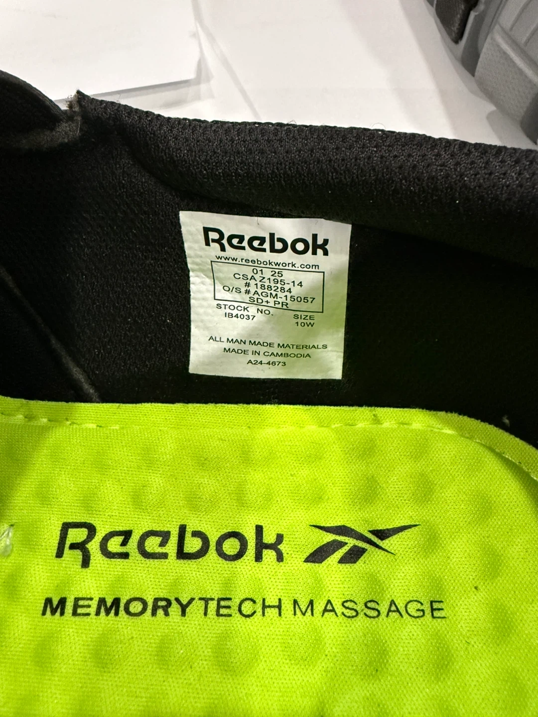 These are a pair of black Reebok slip-on work shoes. They feature MemoryTech Massage cushioning inside. All man-made materials. Made in Cambodia.