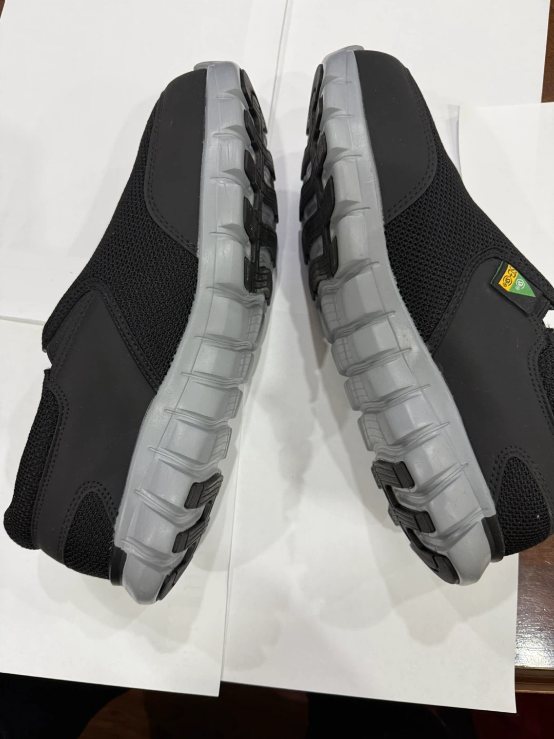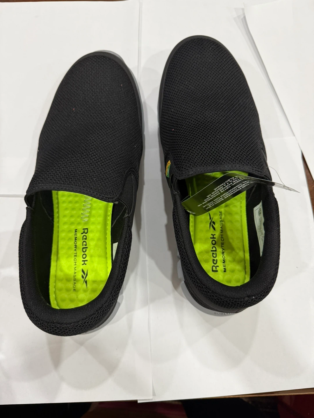These are a pair of black Reebok slip-on work shoes. They feature MemoryTech Massage cushioning inside. All man-made materials. Made in Cambodia.