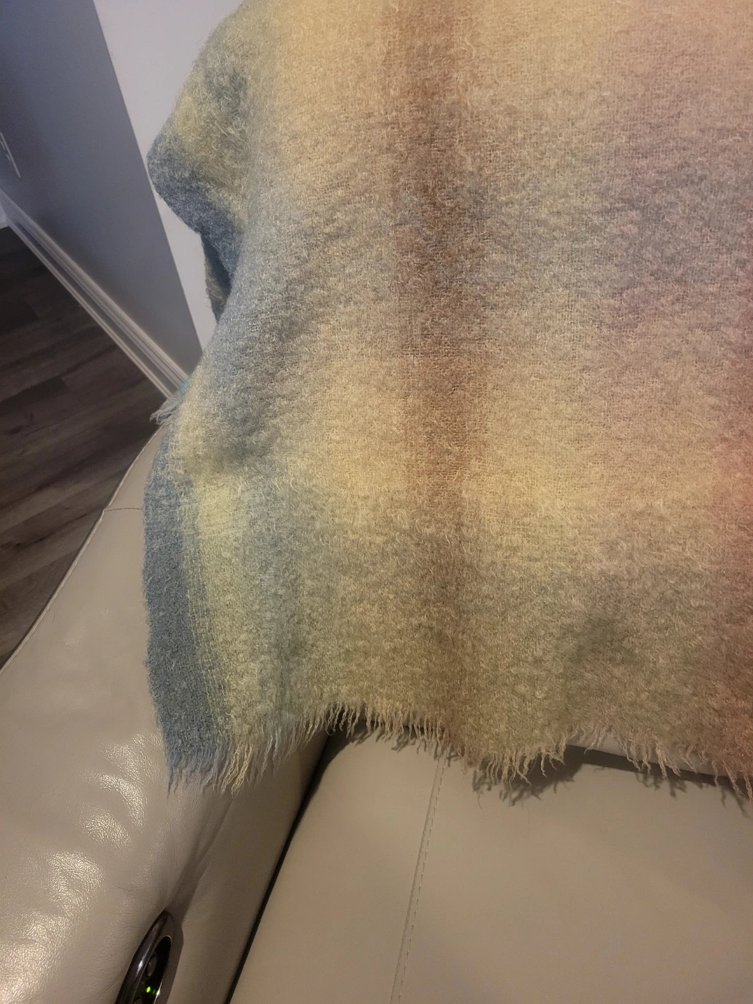 Wrap yourself in luxury with this elegant mohair blanket, showcasing a beautiful blend of pastel shades in a subtle striped pattern. This blanket is in used condition. The dimensions are 60" inches by 44" inches, perfect for adding a touch of warmth and sophistication to any room.