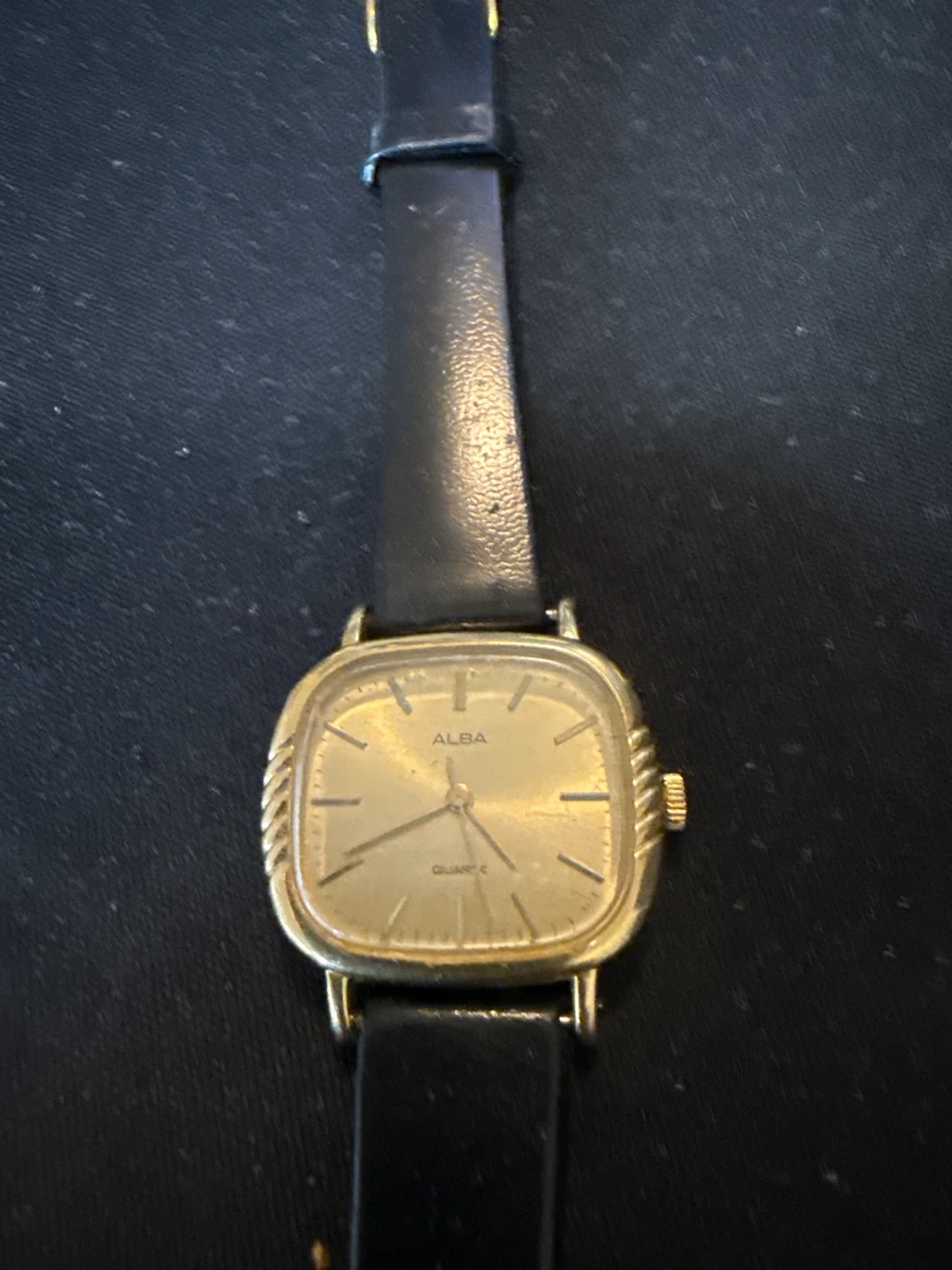 This is an Alba women's quartz watch with a gold-tone square face. It has a black leather band. This watch is a great accessory for everyday wear.
