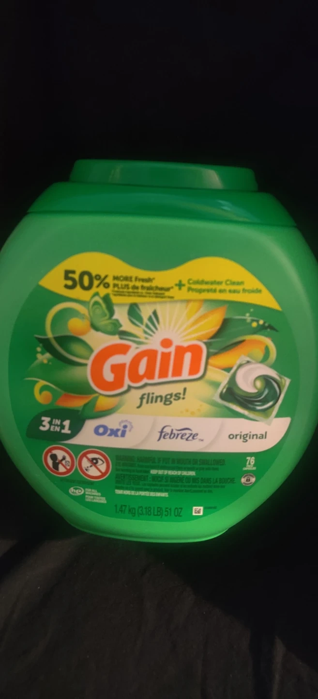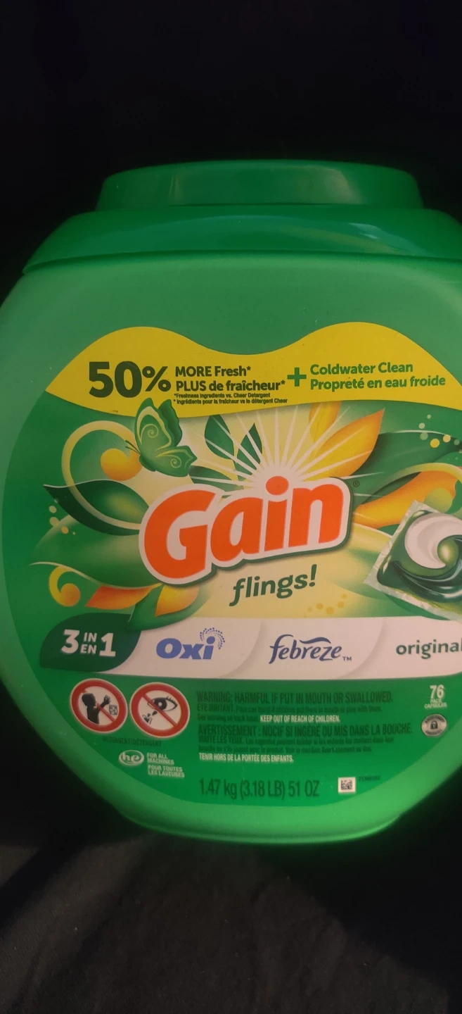 Gain Flings Original laundry detergent pods with Febreze freshness. They're 3 in 1 with Oxi cleaning power. This package contains 76 count capsules. For use in all machines and temperatures.You will have to pick up within 7 days.