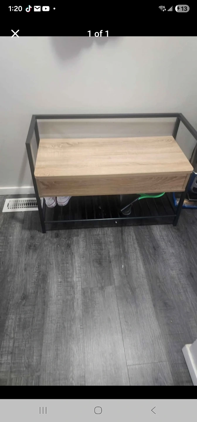 Here's a stylish entryway bench with a handy storage shelf underneath! It's perfect for keeping your shoes and other essentials organized near the door. The bench features a light wood-look top and a sturdy black metal frame. It would look great in any hallway or mudroom!