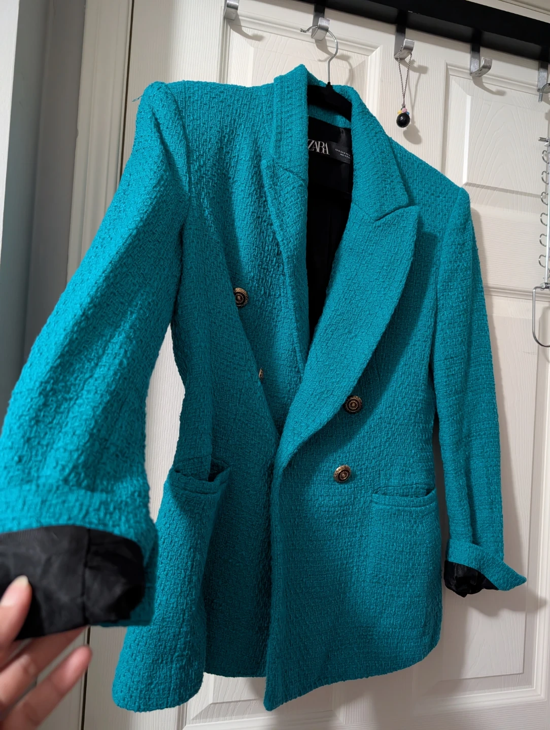 This teal tweed blazer from ZARA features a classic double-breasted design with gold-tone buttons. It has a textured fabric and a sleek black lining. The jacket includes two flap pockets on the front. A sharp addition to any wardrobe!