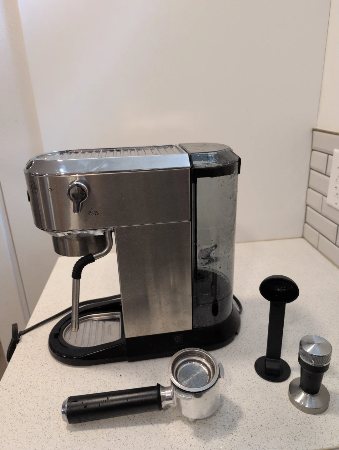 DeLonghi stainless steel espresso machine with portafilter, tamper, and scoop. Features a removable water tank.