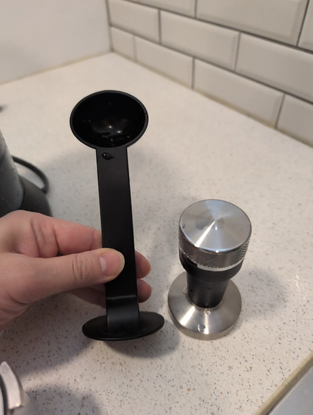 DeLonghi stainless steel espresso machine with portafilter, tamper, and scoop. Features a removable water tank.