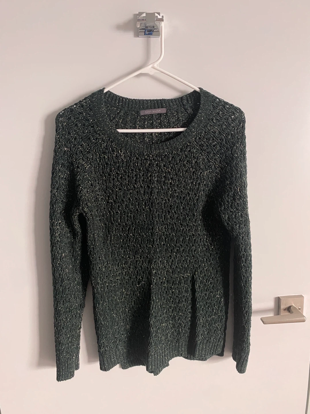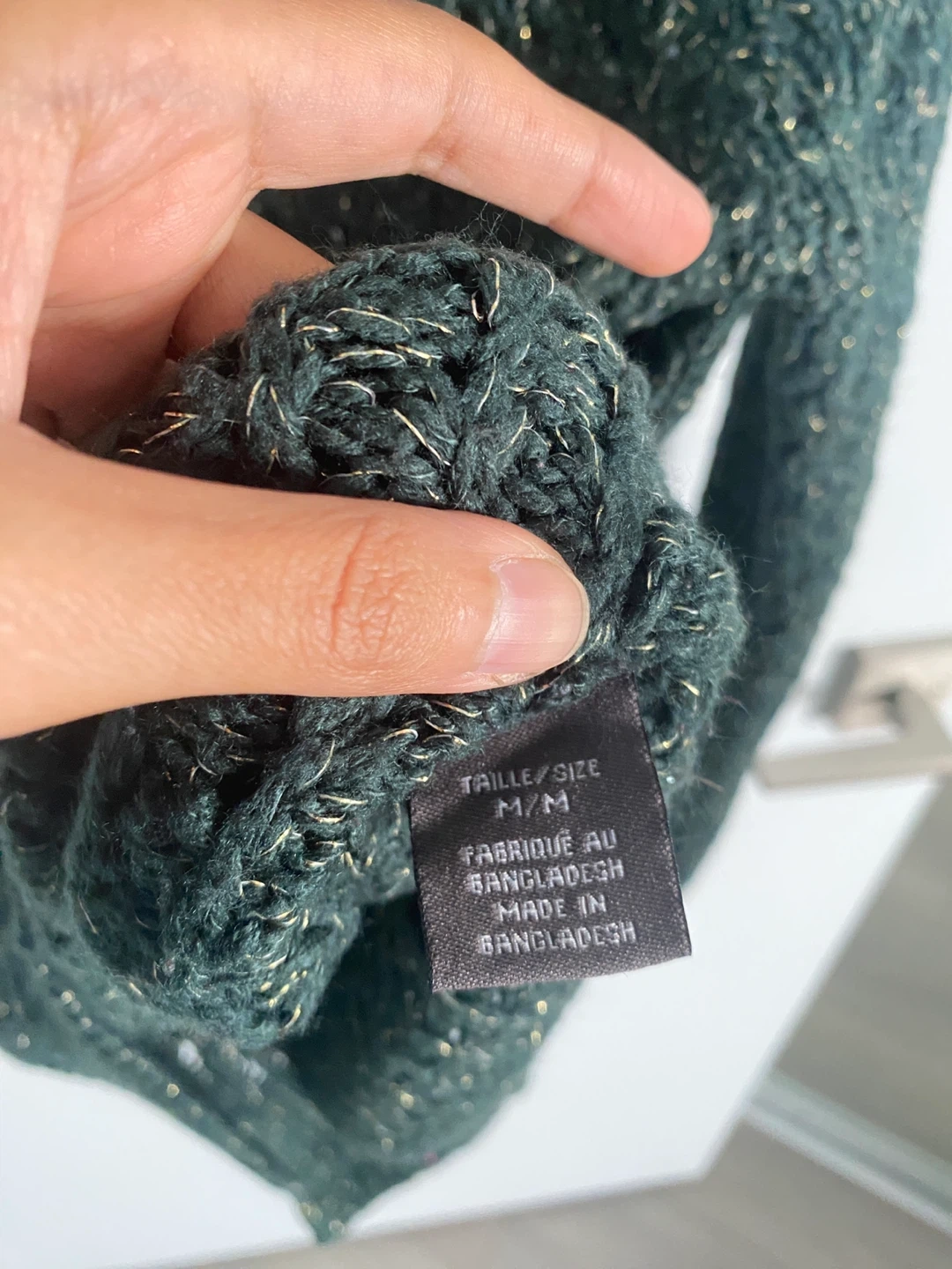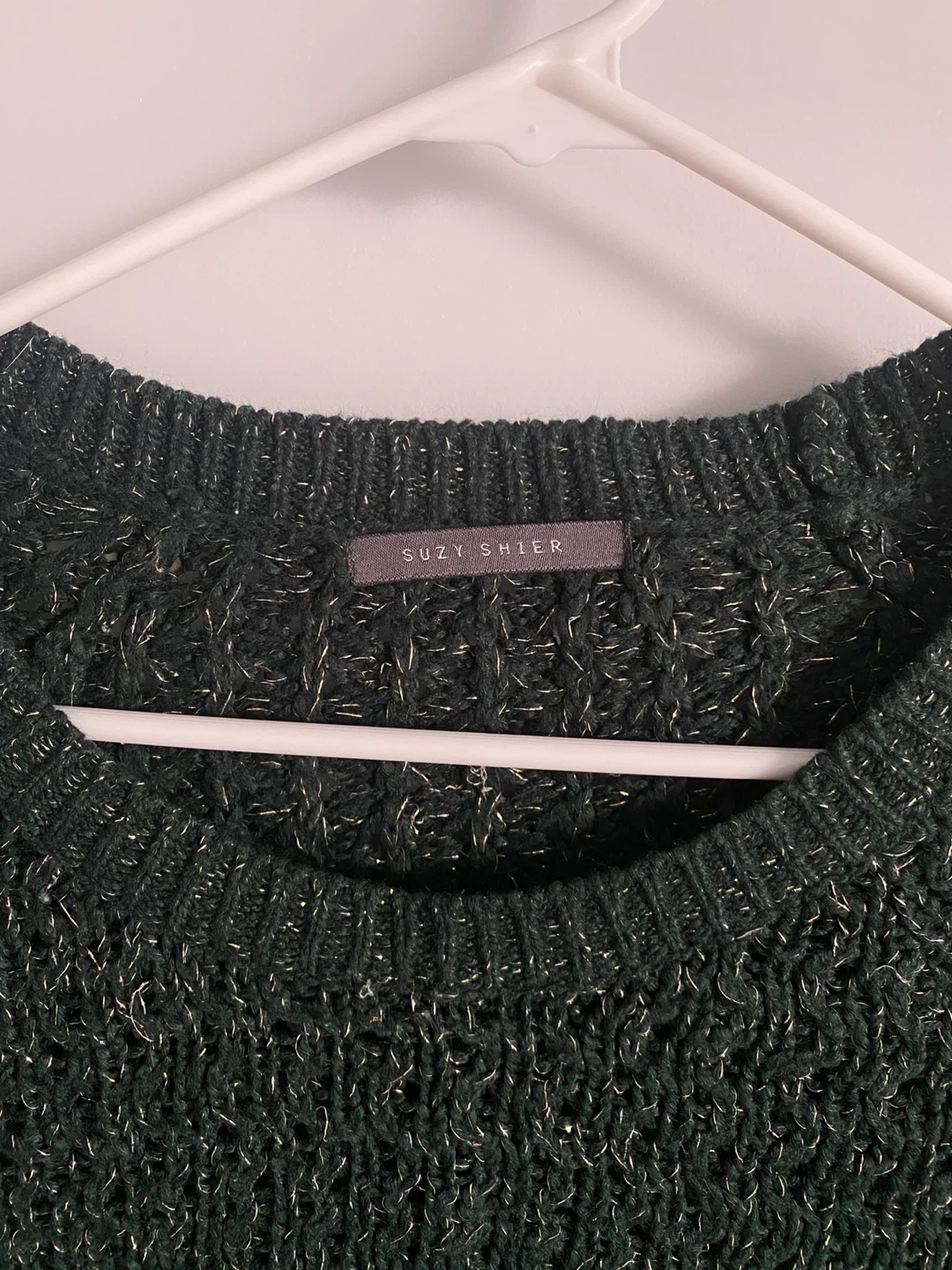 Cozy Gold Thread Green Knit Sweater in size medium. Perfect for adding that subtle shimmer to your outfit while keeping you warm, can be worn on its own or layered!