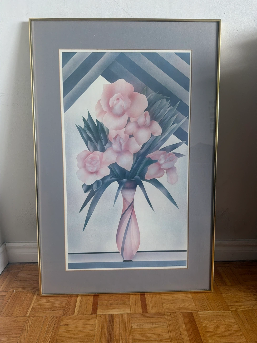 A framed art print featuring pink flowers in a vase with a grey matting. The frame is gold-toned metal. This piece would add a soft touch to any room.