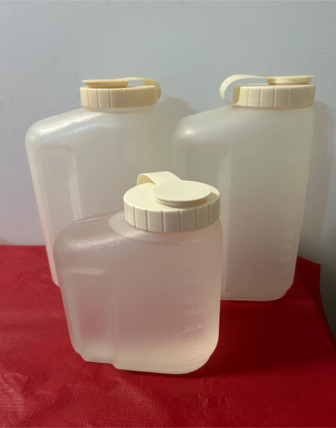 One 1ltr and Two 2ltr Vintage Almond Top Rubbermaid translucent plastic jugs with measurement markings.